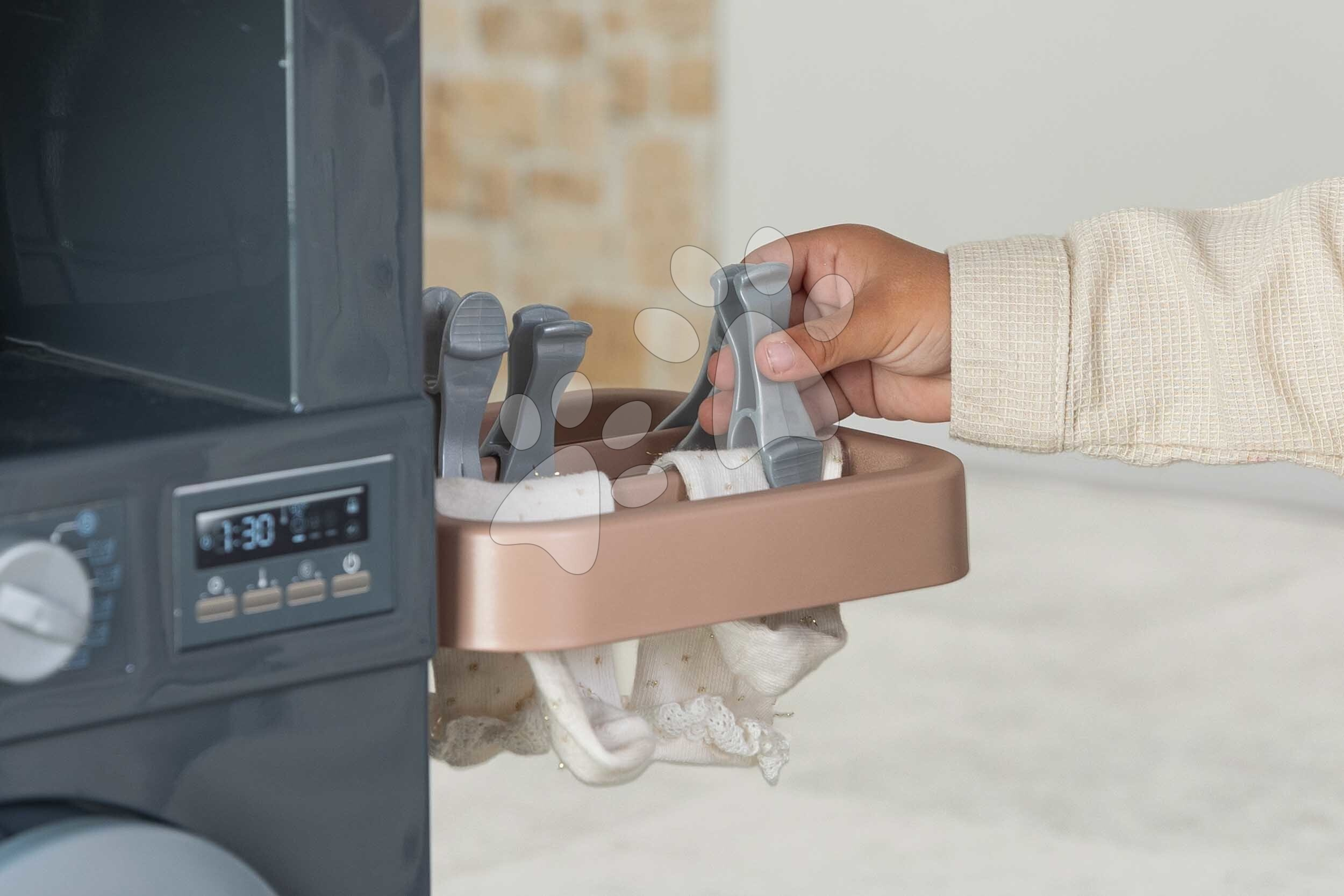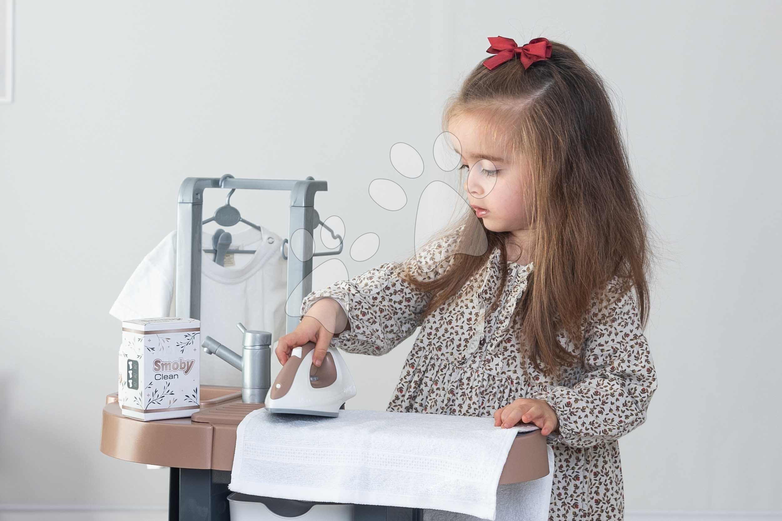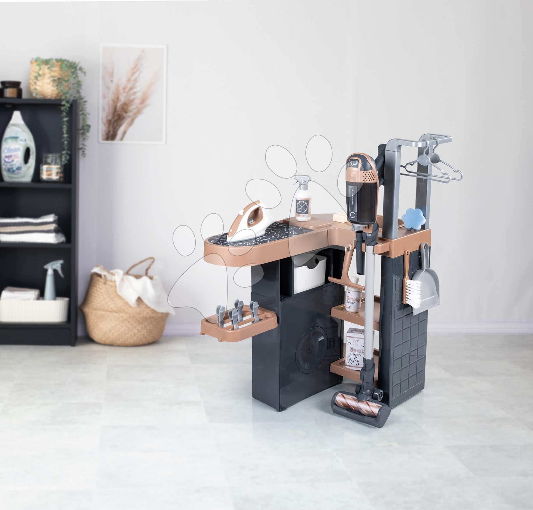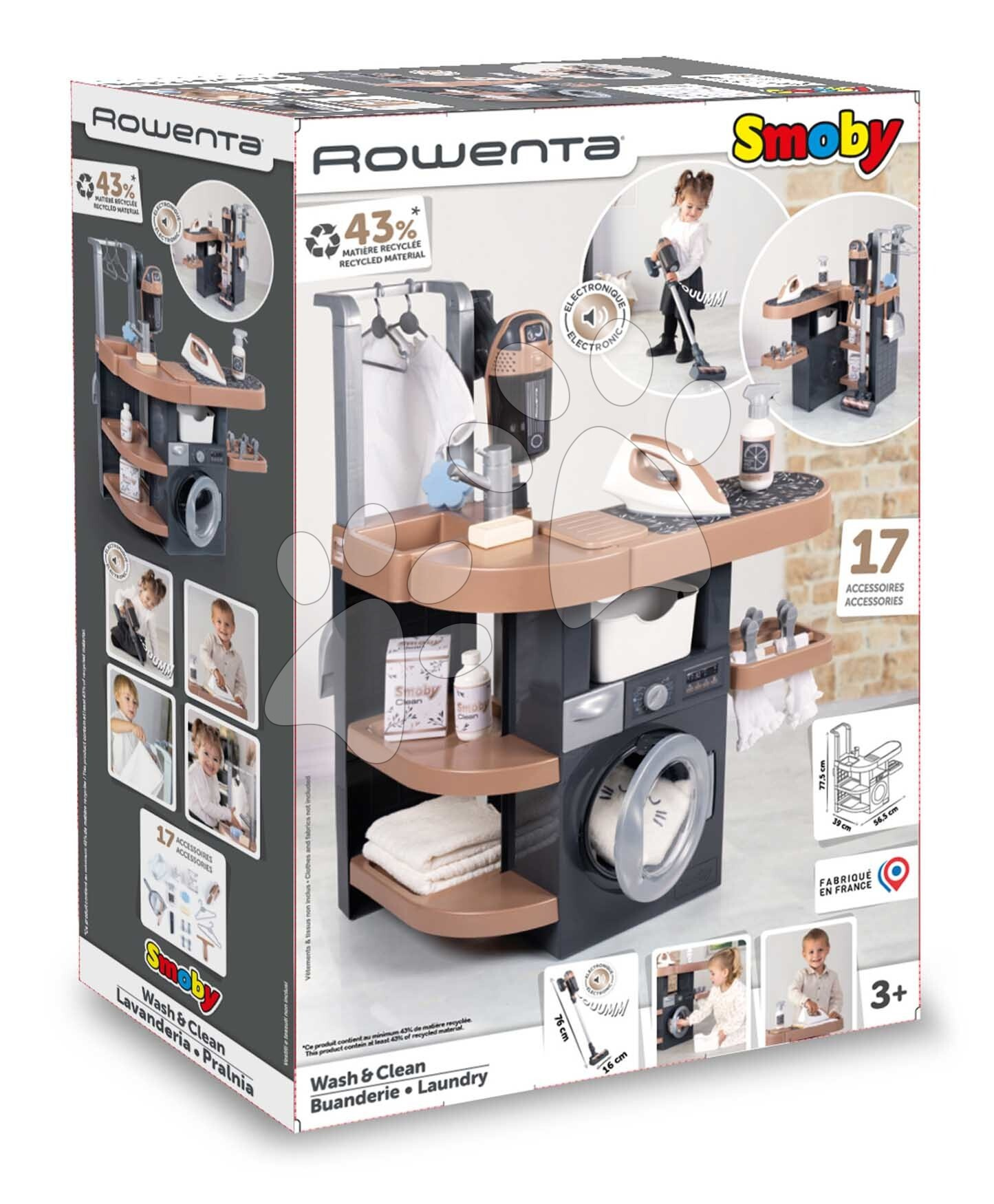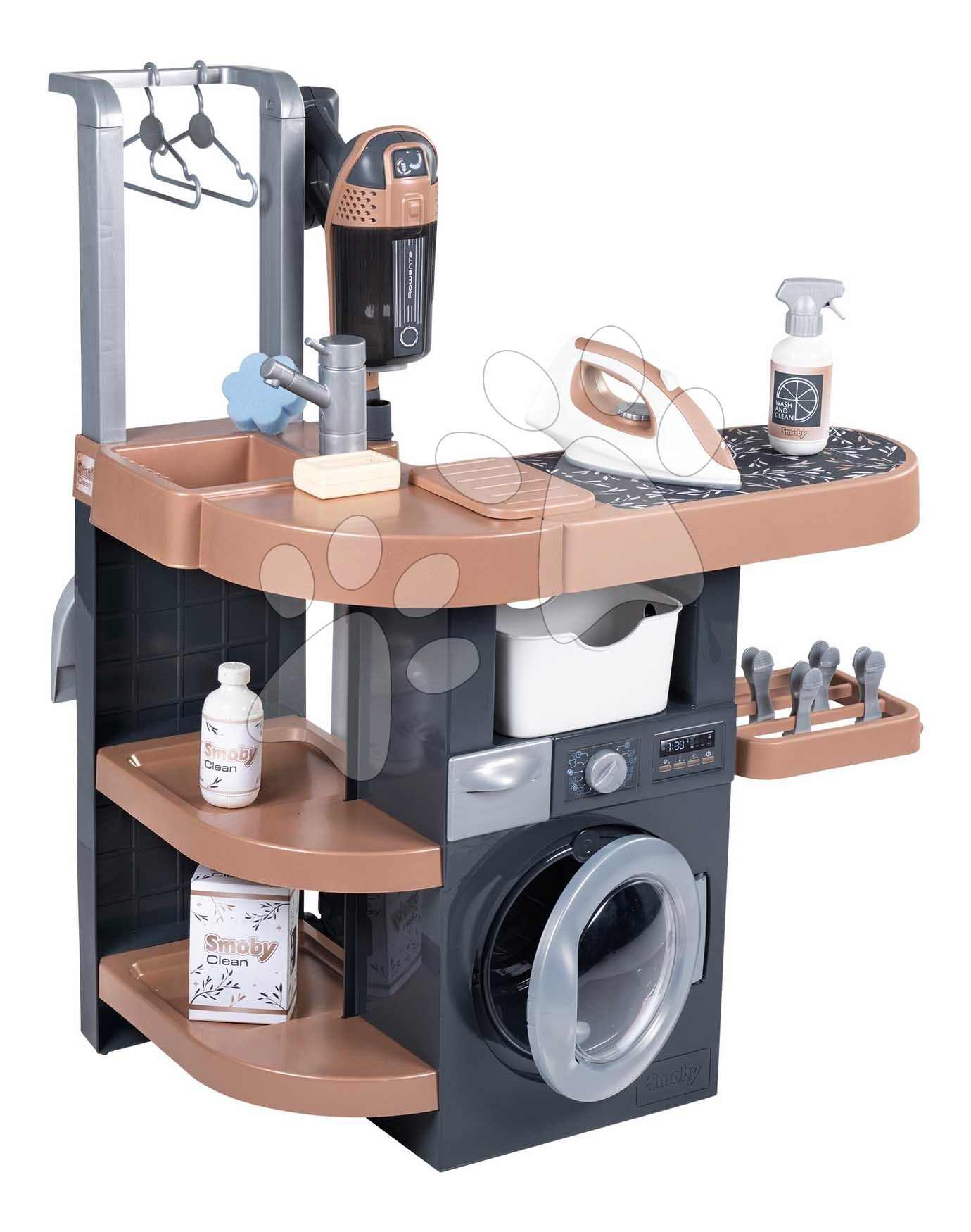 Prádelna s pračkou s předním plněním Rowenta Wash&Clean Laundry od francouzského výrobce Smoby potěší všechny děti od 3 let, kterým nabídne realistické zážitky při praní, žehlení a sušení prádla. Multifunkční prádelna ve tvaru písmene L umožní dětem přístup z více stran, zahrají si s ní sourozenci i kamarádi. Při úklidu budou mít děti k dispozici také tyčový elektronický vysavač s vyměnitelným nástavcem, který dokáže vydávat zvuky jako při skutečném vysávání.