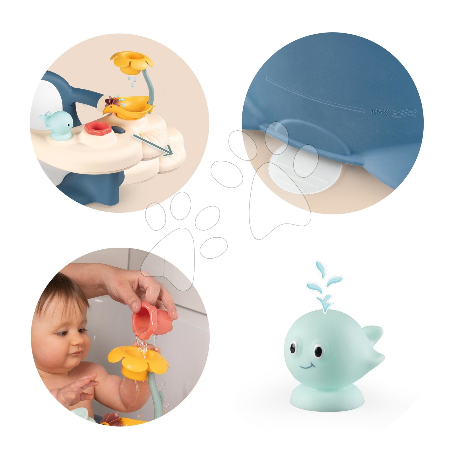 S hracím stolkem zažijí děti spoustu krásných chvil. Z velké květinky teče voda jako ze sprchy do bazénku s točícím se vodním mlýnem, odtud vytéká zpět do vany. Rovněž se výborně zabaví s krásnou modrou velrybou, která se vykoupe spolu s nimi. Je to skvělá hračka pro každé dítě do vaničky, díky čemuž bude koupání obrovská zábava. Smoby je renomovaný francouzský výrobce plastových hraček pro děti. Plast je pevný, odolný, ale zároveň jemný a hladký k dětským ručkám, sametový na dotek. Proces výroby hraček je přísně kontrolován, hračky splňují i nejvyšší bezpečnostní kritéria. Rozměry produktu jsou 42*34*25 cm.