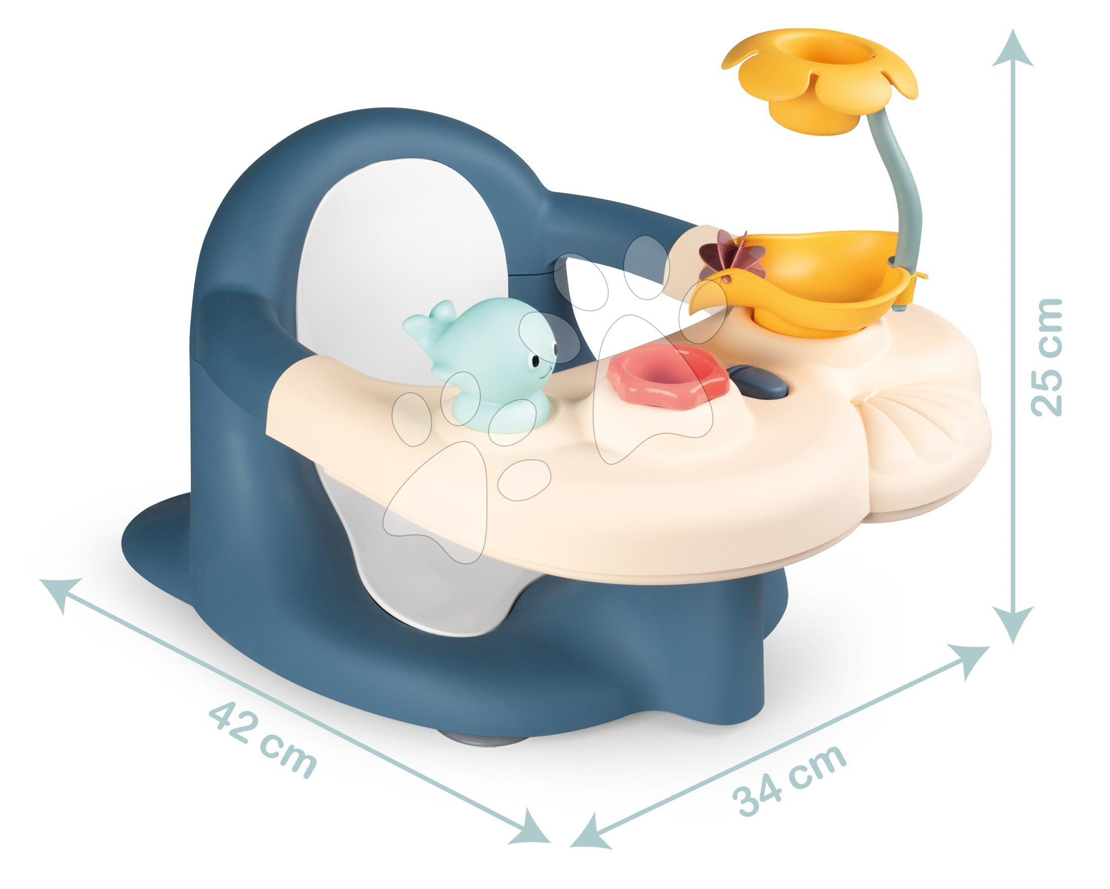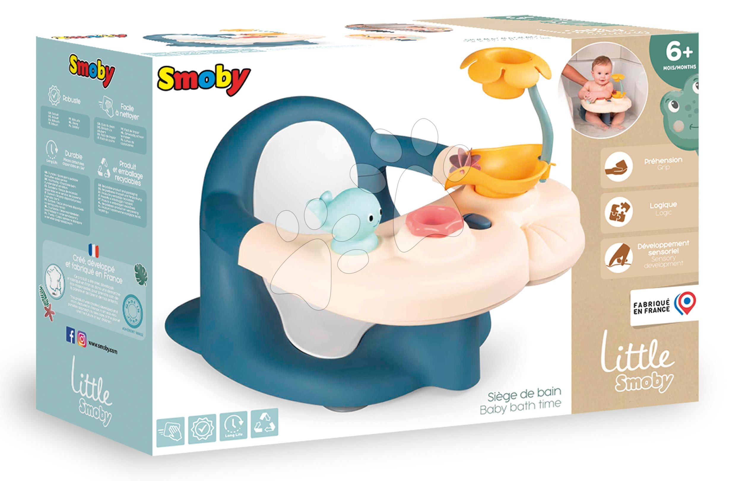 Dětské sedátko do vany Baby Bath Time Little od francouzského výrobce Smoby je skvělý doplněk ke koupání pro nejmenší děti již od 6 měsíců. Chlapci a holčičky sedí pohodlně na sedátku jako na židli a během koupání si výborně zahrají s vodními hračkami. Ergonomické sedátko pro děti je vyrobeno z kvalitního a jemného plastového materiálu, má oblé tvary, takže jsou v něm děti v bezpečí. Křeslo pro děti do vaničky se skládá ze dvou částí - ze stolku s hračkami a z křesla. Sedací část je vhodné pro dítě s minimální hmotností od 6 do 13 kg.