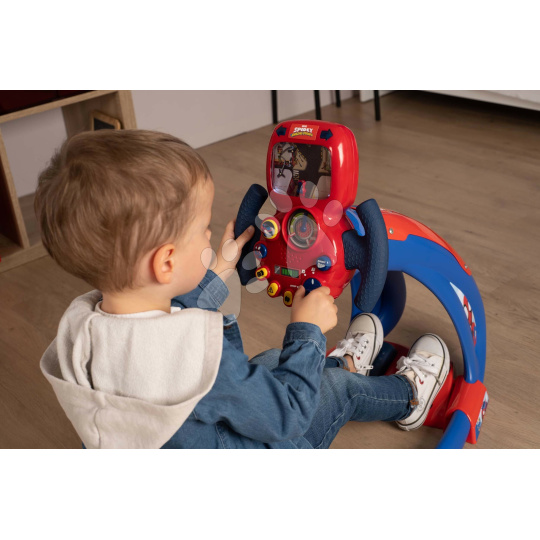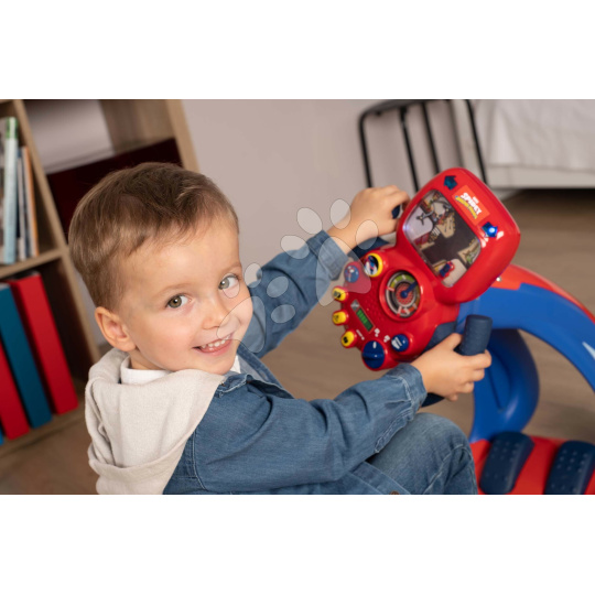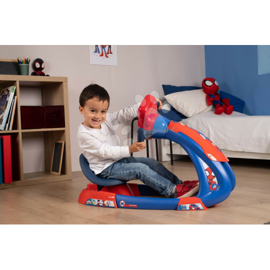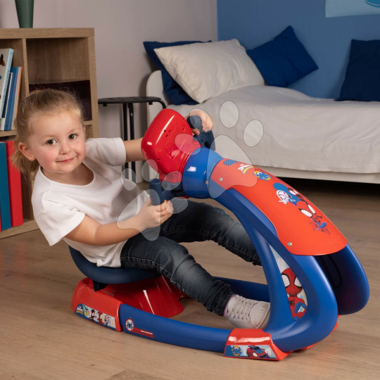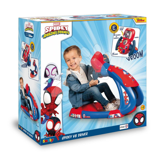 Trenažér Spidey V8 Driver Marvel od francouzského výrobce Smoby představuje vynikající dárek pro všechny děti od 3 let, které si oblíbily animovaného hrdinu Spidermana. Originální modro-červený trenažér je vybaven nastavitelným ergonomickým sedadlem ve 3 polohách, mechanickými pedály a brzdou. Při jízdě budou mít kluci a holčičky k dispozici elektronický volant, který je vybaven světelnými a zvukovými efekty, díky čemuž zažijí realistické zážitky při jízdě po rolující mapě.