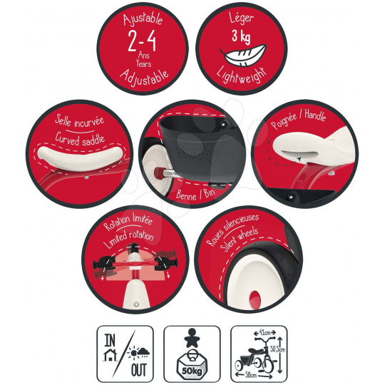 V zadní části tříkolky je umístěn box na hračky a pod sedadlem se nachází praktické držadlo, díky kterému lze tříkolku snadno přenášet. Protiskluzová řídítka jsou vybavena bezpečnostním systémem, který umožňuje dítěti při jízdě otáčet řídítky pouze do určitého úhlu, takže se bude při jízdě cítit bezpečně a komfortně. Také lze výškově nastavit pro děti ve věku od 2 do 4 let.