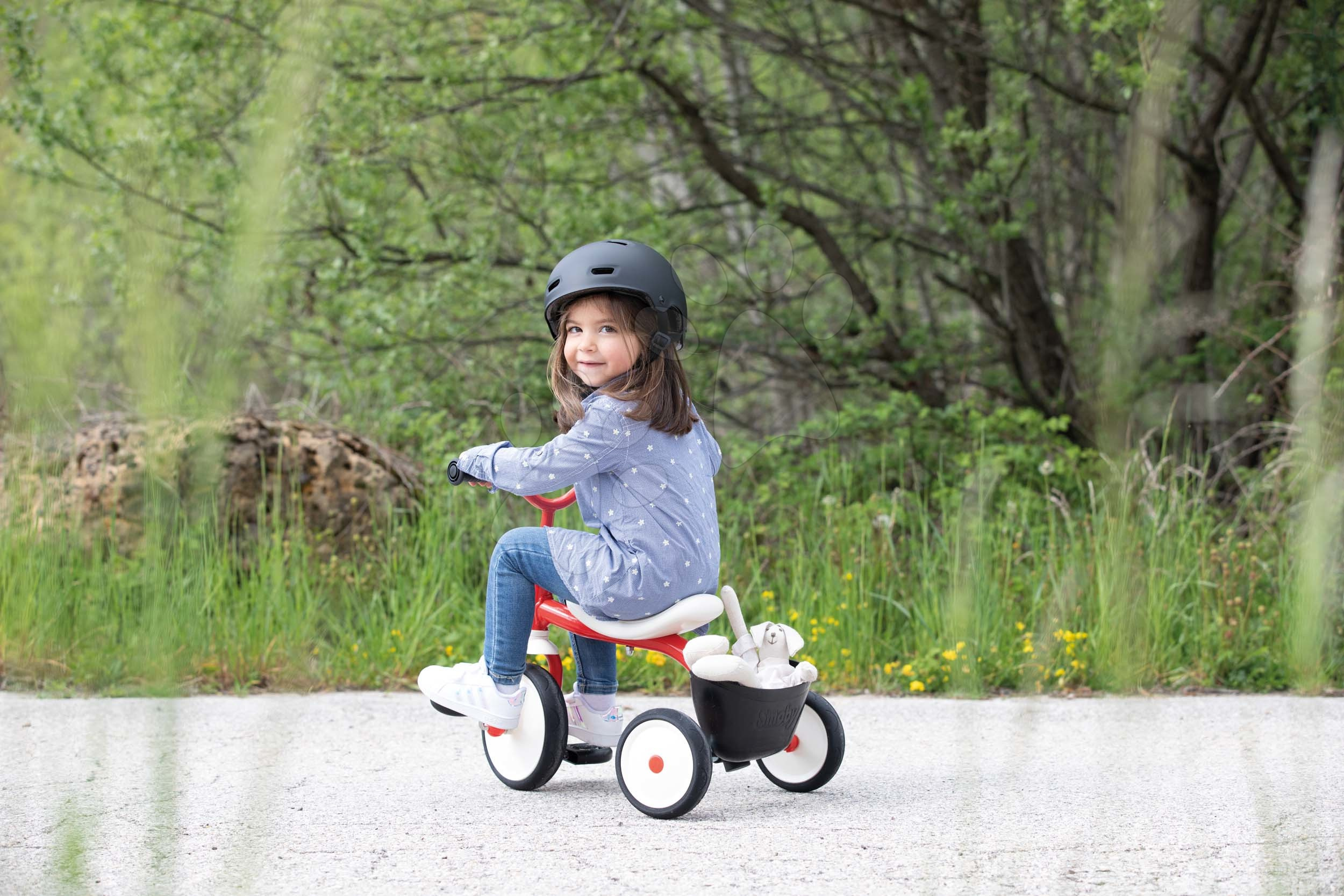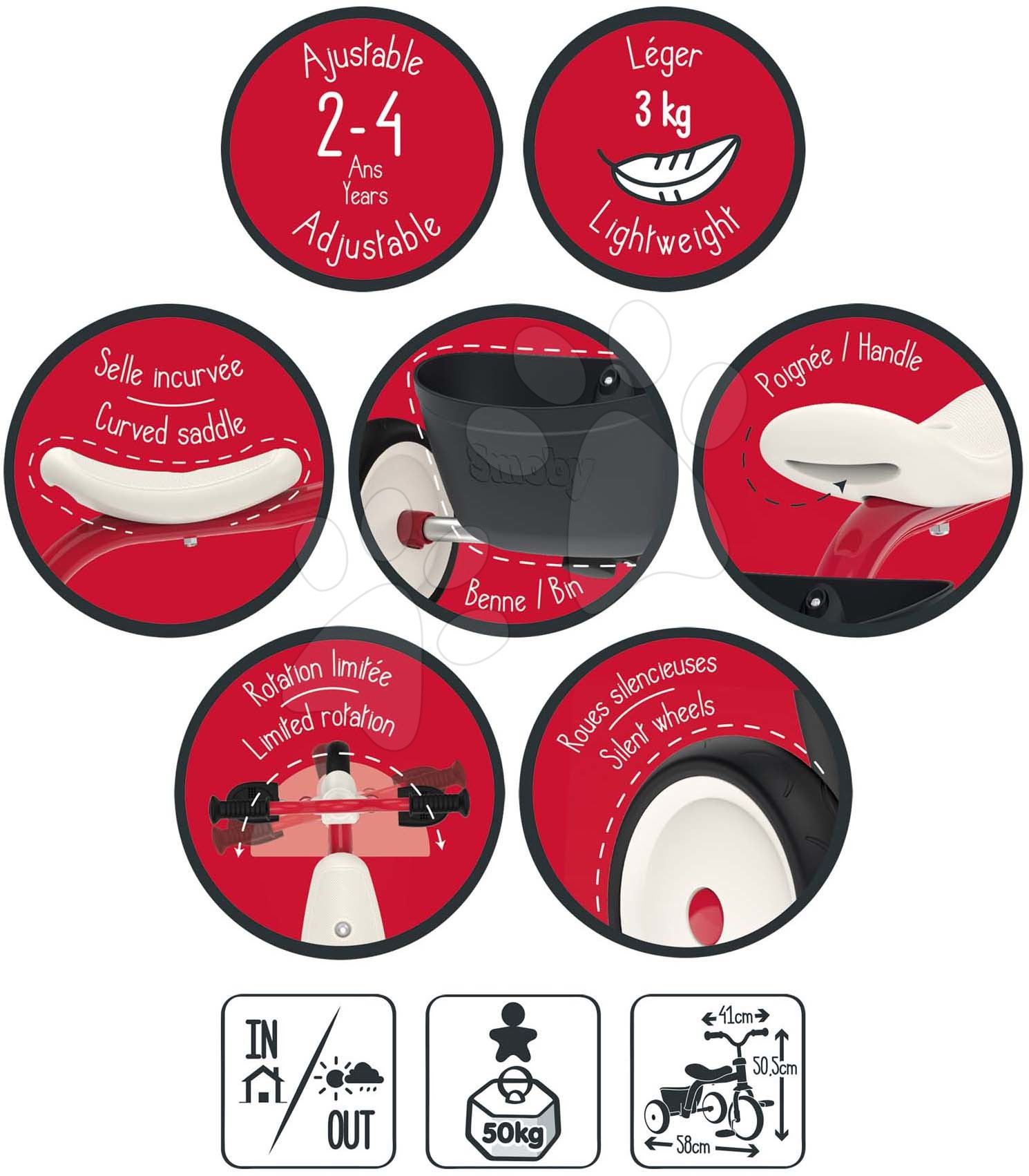 V zadní části tříkolky je umístěn box na hračky a pod sedadlem se nachází praktické držadlo, díky kterému lze tříkolku snadno přenášet. Protiskluzová řídítka jsou vybavena bezpečnostním systémem, který umožňuje dítěti při jízdě otáčet řídítky pouze do určitého úhlu, takže se bude při jízdě cítit bezpečně a komfortně. Také lze výškově nastavit pro děti ve věku od 2 do 4 let.