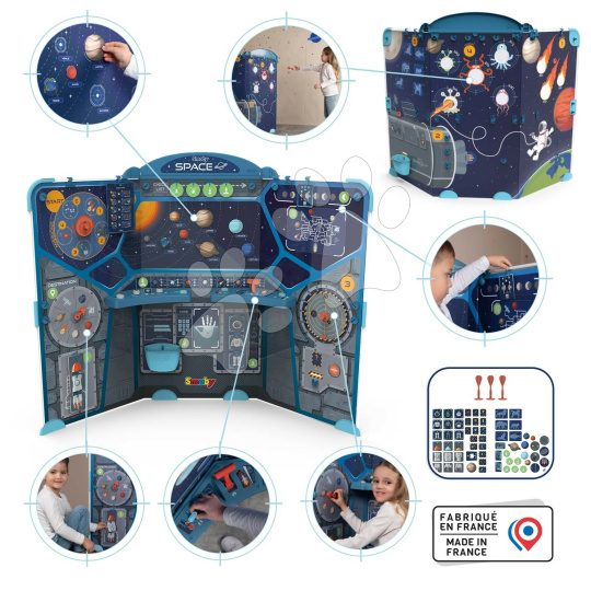 Vesmírná škola Space Center připraví dětem od 5 let skvělé zážitky při hře na povolání astronautů, hravou formou se naučí spoustu nových poznatků o vědě a technice. Chlapci a dívky budou objevovat svět vesmíru, zahrají si na vesmírné instruktory a piloty vesmírné lodi. K dispozici budou mít vesmírnou stěnu, na které jsou vyobrazeny obrázky planet, různé druhy aktivit a ovládací panel pro řízení vesmírné lodi. Skládací vesmírná třída je vyrobena z pevného kartonu a odolných plastů, kovový rám zaručí její dlouhou životnost. Rozměry ve složeném stavu jsou 111*41 cm, díky čemuž lze snadno schovat pod postel či uložit do skříně. V rozloženém stavu má vesmírná stěna rozměry 111*135 cm.