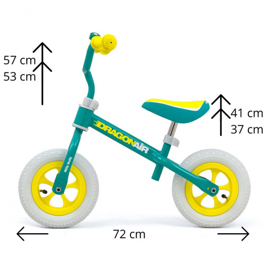 Dětské odrážedlo-kolo Milly Mally DRAGON AIR je ideální, když se dítě učí udržet rovnováhu. Díky širokým nafukovacím gumovým pneumatikám z odolného materiálu zabezpečí stabilitu a bezpečnost na různých površích. Nastavitelné řídítka a sedlo zabezpečí, že kolo "poroste" s malým cyklistou. Neklouzavé rukojeti a vhodně profilované sedlo poskytne pohodlí při objevování nových "cyklistických tras".