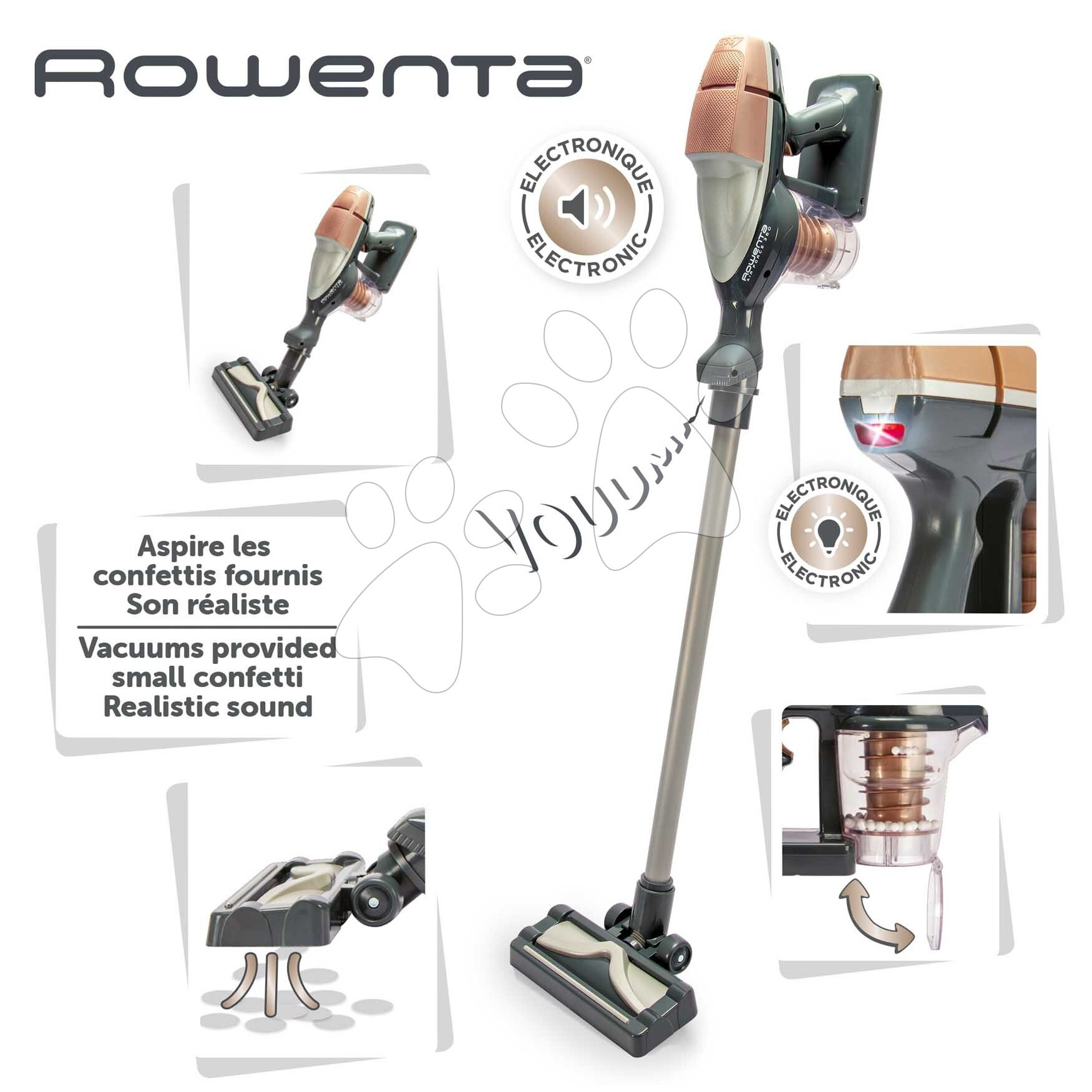 Tyčový vysavač Rowenta Air Force Vacuum Cleaner z dílny francouzských návrhářů Smoby je vynikající dárek pro děti od 3 let, které se mohou těšit na zábavné vysávání ve svém pokojíčku. Dětský vysavač dokáže vydávat zvuky a svítí, díky čemuž působí velmi realisticky. Při zapnutí vysavače LED kontrolka upozorňuje na to, že je vysavač zapnutý a děti se mohou těšit na zvuk vysávání. Nádobu na prach lze po skončení otevřít a vyprázdnit – součástí jsou i kuličky, které vytvářejí při hře ještě realističtější zážitek. Svými rozměry 75*15*8 cm a nízkou váhou je vhodnou hračkou pro děti, které chtějí doma pomáhat.