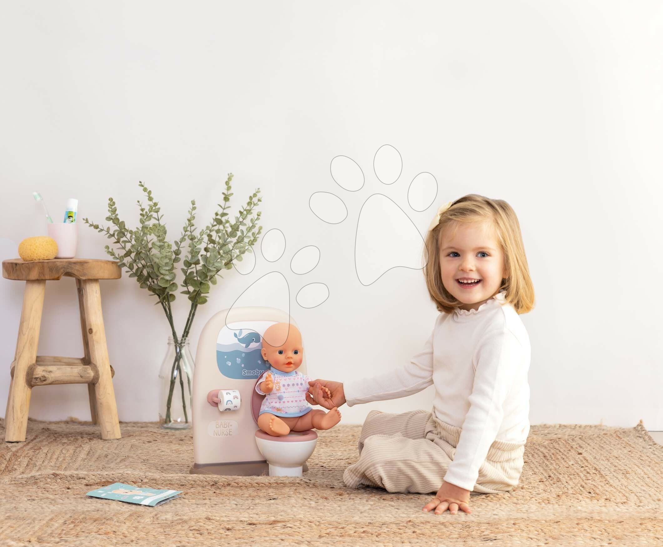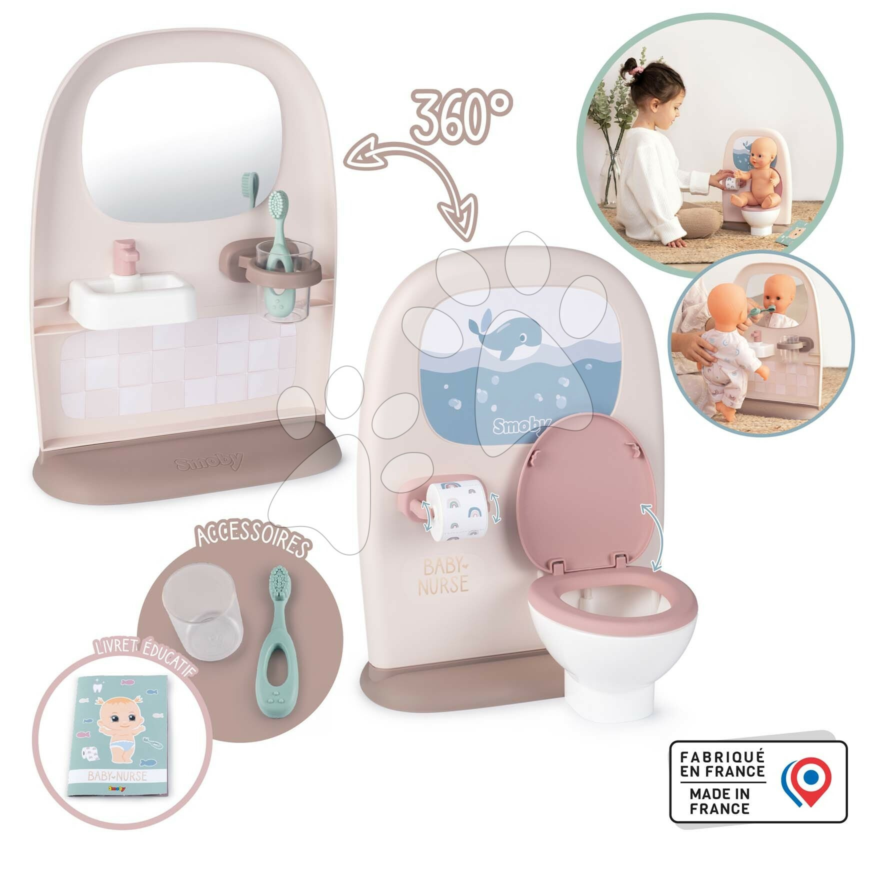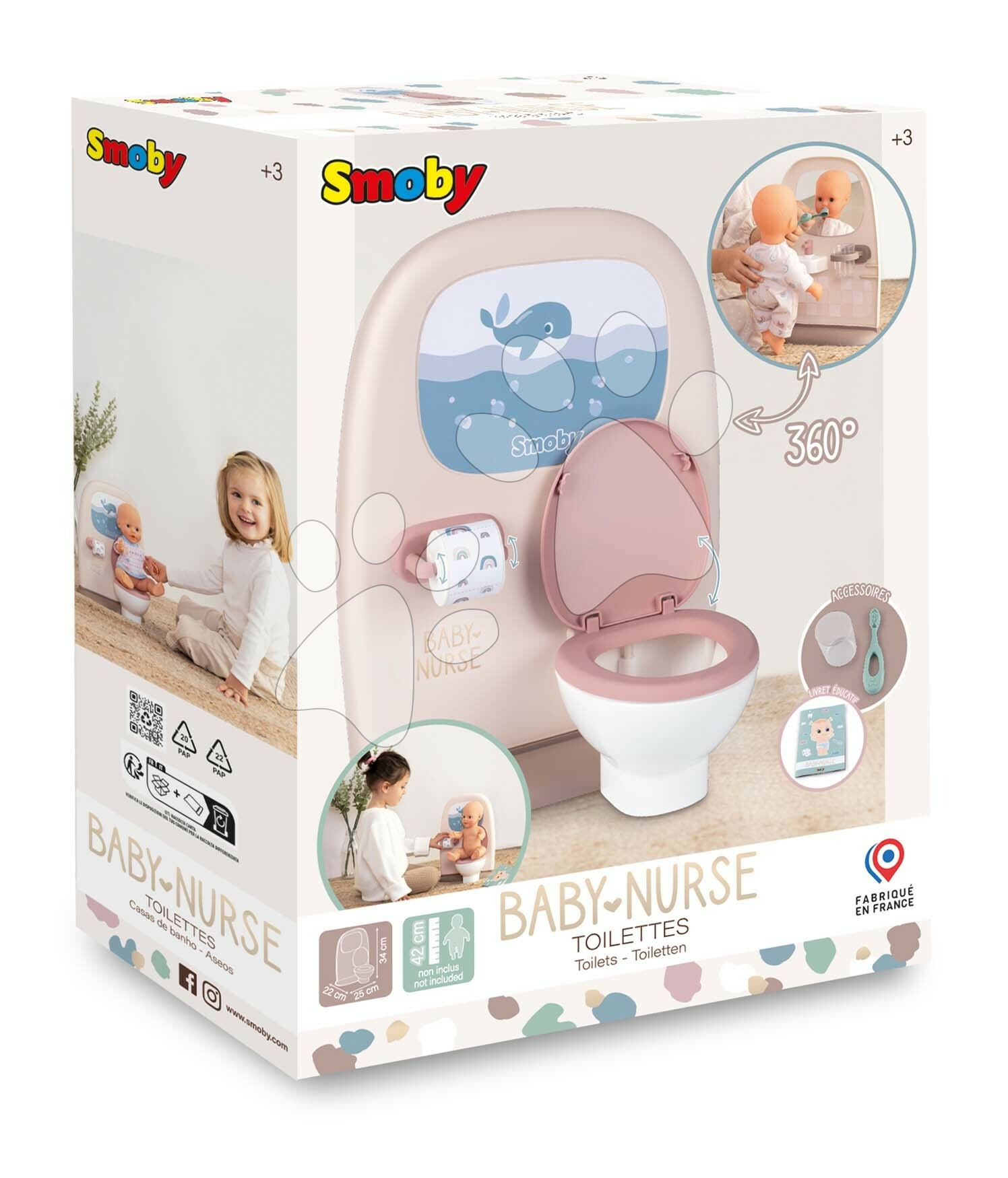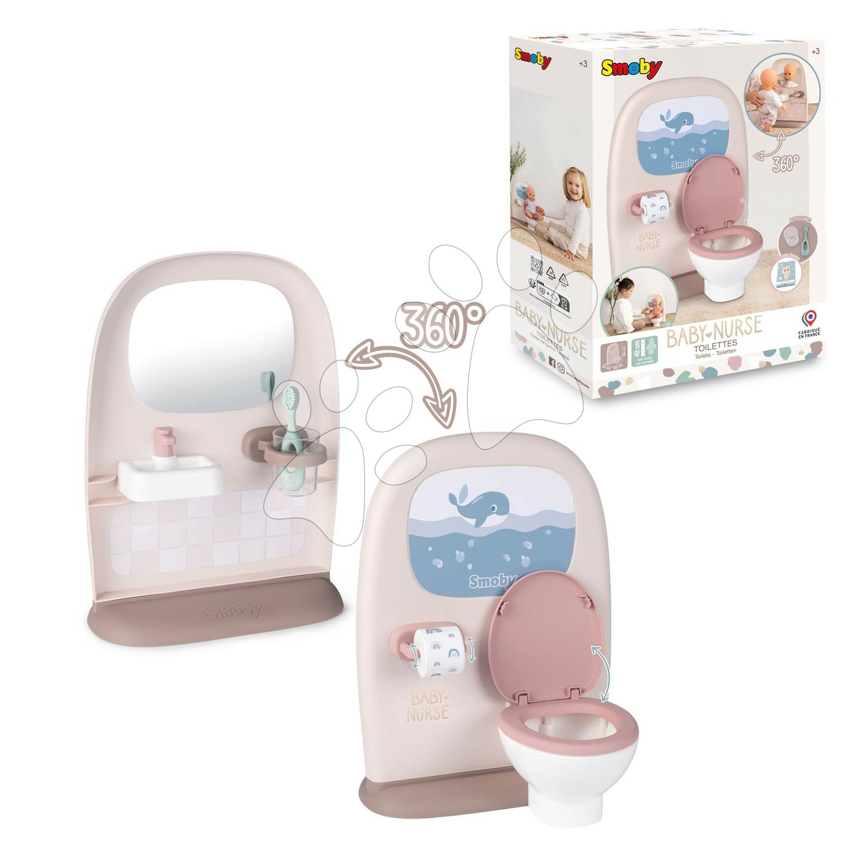 Záchod a koupelna pro panenky Toilets 2v1 z kolekce Baby Nurse od francouzského výrobce Smoby zaujme všechny děti a zejména holčičky od 3 let. Nádherný záchod a koupelna pro panenky je vyhotoven v krásných pastelových barvách, ozdobí každý dětský pokojíček. Děti se díky této skvělé hračce postarají o panenku, naučí ji základním hygienickým návykům a výborně se přitom baví. Hračka pro péči o panenky je oboustranná, na jedné straně je klasické WC s otevíratelným víkem a toaletním papírem, na druhé straně se nachází koupelna se zrcadlem, umyvadlem a zubním kartáčkem v kelímku.