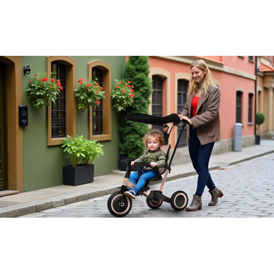 Díky chytré konstrukci lze jednotlivé části jednoduše odejmout nebo přestavět – bez potřeby nářadí. Přechod z tříkolky na odrážedlo nebo kolo je otázkou několika minut. Tříkolka má navíc kompaktní rozměry, takže se bez problému vejde do kufru auta a je vhodná i na cestování.