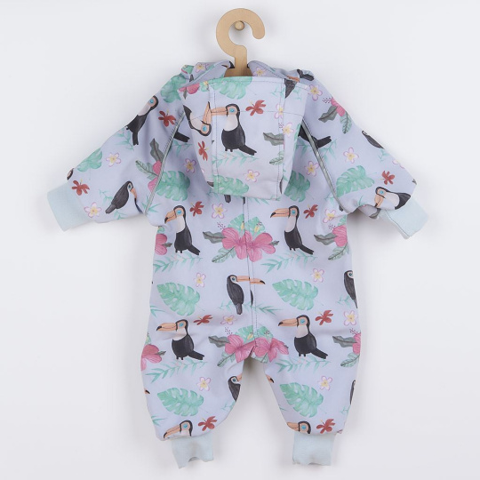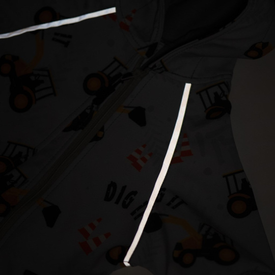 Nápaditý softshellový kojenecký overal New Baby. Overal je celopotištěný dětským vzorem. Overálek je vyroben v České republice z kvalitního materiálu softshell. Materiál je hladký, elestický, měkký a příjemný na dotek. Do určitého stupně je také voděodolný, nenasakuje vodu a je odolný vůči znečištění. Praktické zapínání na zip po celé délce velmi usnadní oblékání a přebalování. Zip je po celé délce podšitý látkou, a tím je zamezeno profukování větru na pokožku miminka. Kombinéza má praktickou kapuci, širší pružné lemy na rukách a nohavičkách a celá vnitřní strana je zateplená krátko střiženým polarem, který zvyšuje komfort nošení a zajišťuje teplo. Na rukávcích jsou našité reflexní paspulky. Softshellový overálek je vhodný jako sportovní oblečení, je odolný větru a zároveň prodyšný. Miminko se bude cítit velmi pohodlně a příjemně.