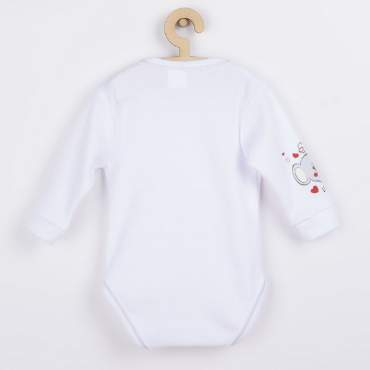 Krásná bavlněná kojenecká 4-dílná soupravička New Baby. Soupravička obsahuje čepičku se zavazování na tkaničky, body s dlouhým rukávem s bočním zapínáním, dupačky a rukavičky. Čepička, body a dupačky mají natištěný veselý obrázek. Barvy použité k potisku jsou certifikované a vhodné pro miminka. Soupravička je vyrobená z příjemného a kvalitního materiálu. Body má praktické zapínání na cvočky po celé délce a mezi nožičkami. Dupačky mají zapínání na cvočky na ramínkách a mezi nožičkami. Složení: 100% bavlna. Rozměry: dupačky - obvod kolem hrudníku 45 cm, délka od ramínek 47 cm, délka od rozkroku cca 16 cm, body - obvod kolem hrudníku 42 cm, délka od ramínek 32 cm, délka rukávu cca 18 cm. Rukavičky 8 cm. Čepička - obvod kolem hlavičky 36 cm.
