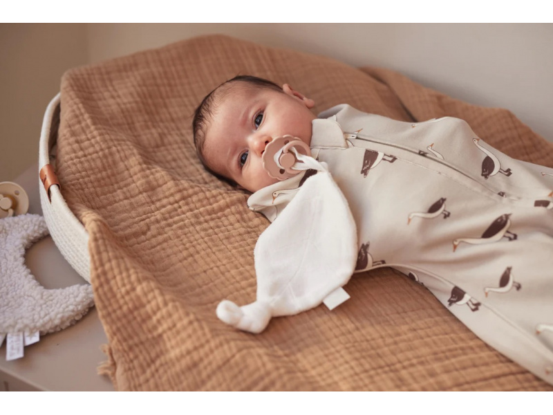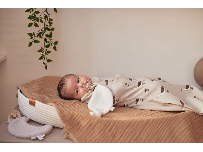 Zavinovací spací pytel je určen pro spaní miminek od narození s ručičkami uvnitř. Zavinutí horní poloviny těla miminka s ručičkami uvnitř spacího pytle pomáhá předcházet reflexním pohybům rukou, které mohou dítě snadno probudit. Rozšířená spodní část spacího pytle umožňuje volný pohyb a přirozenou polohu nožiček, která je důležitá pro správný vývoj kyčlí. Dlouhý zip usnadňuje ukládání miminka do spacího pytle. Spací pytel je testován na TOG hodnotu, která určuje hřejivost spacích pytlů a dek. Čím vyšší je hodnota TOG, tím je produkt teplejší. Spací pytel má hodnotu TOG 0,5, jedná se tedy o lehký spací pytel, který je možné v chladnějším prostředí doplnit přikrývkou. Materiál: 100% bavlna Délka spacího pytle je 58 cm. Určeno pro děti od narození do 3 měsíců.
