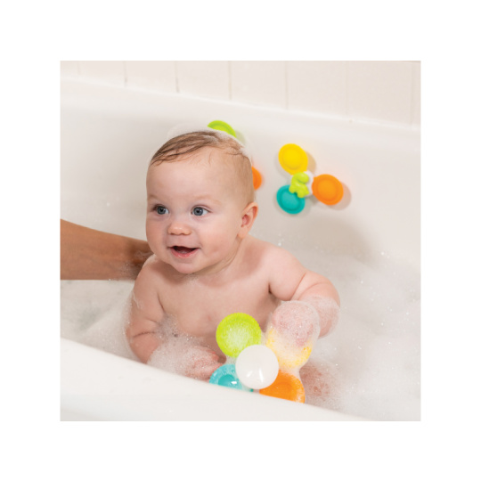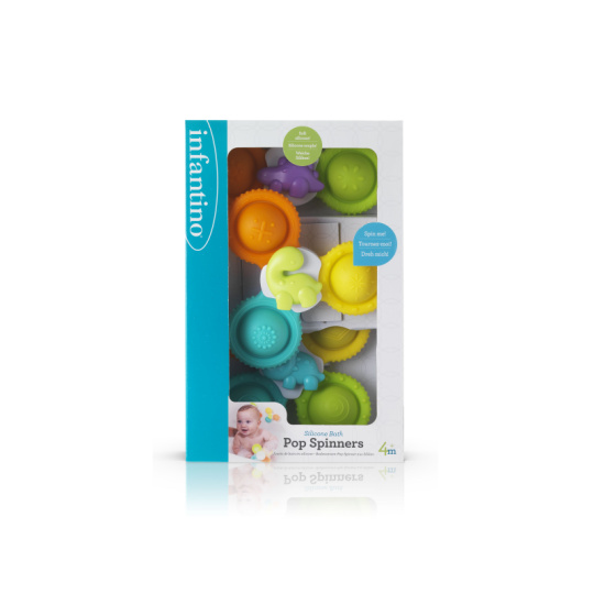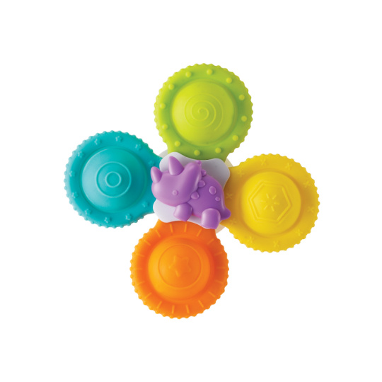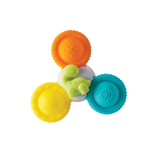 Sada tří barevných spinnerů s přísavkou přinese spoustu zábavy vašemu dítěti i vám při každodenním koupání. Spinnery s přísavkou stačí připevnit na vanu a jeden po druhém roztočit. Spinnery v krásném provedení s postavičkou dinosaura ve středu hračky jsou vyrobené z jemného silikonu. Hraní s hračkami ve vodě pomáhá rozvíjet jemnou motoriku i jednotlivé smysly dítěte. Vhodné pro děti od 4 měsíců.
