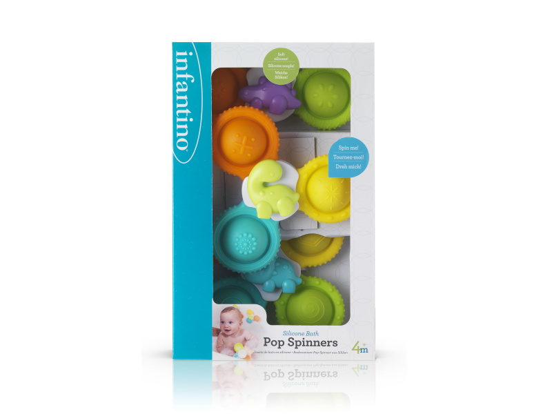 Sada tří barevných spinnerů s přísavkou přinese spoustu zábavy vašemu dítěti i vám při každodenním koupání. Spinnery s přísavkou stačí připevnit na vanu a jeden po druhém roztočit. Spinnery v krásném provedení s postavičkou dinosaura ve středu hračky jsou vyrobené z jemného silikonu. Hraní s hračkami ve vodě pomáhá rozvíjet jemnou motoriku i jednotlivé smysly dítěte. Vhodné pro děti od 4 měsíců.