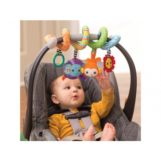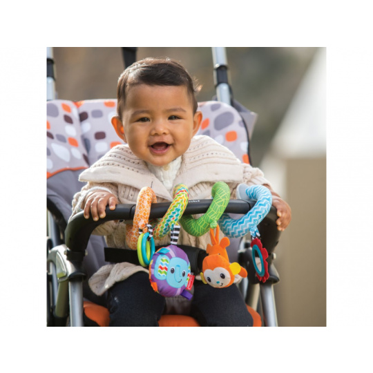 Spirálu snadno připevníte k madlu kočárku, autosedačky či na postýlku. Zavěšené chrasticí a šusticí hračky ve výrazných barvách upoutají pozornost dítěte a pomáhají rozvoji jeho smyslů. Vhodné pro děti od narození.