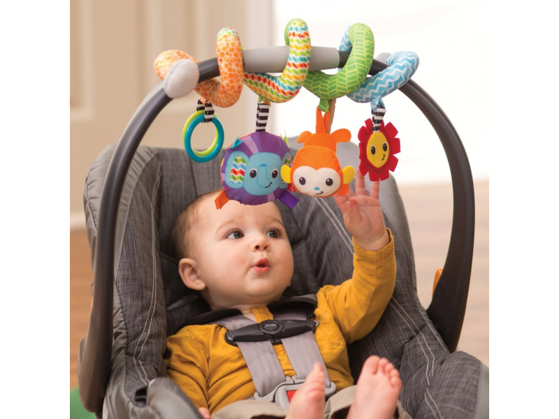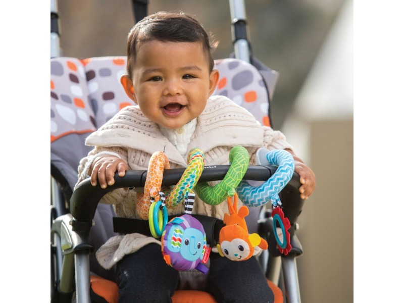 Spirálu snadno připevníte k madlu kočárku, autosedačky či na postýlku. Zavěšené chrasticí a šusticí hračky ve výrazných barvách upoutají pozornost dítěte a pomáhají rozvoji jeho smyslů. Vhodné pro děti od narození.