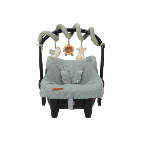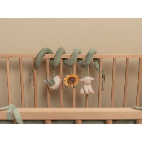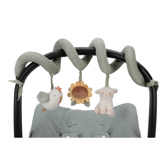 Textilní spirála se zavěšenými hračkami v podobě slepičky, ovečky a slunečnice zabaví vaše miminko v postýlce, kočárku i v autosedačce. Měkké hračky vyrobené z jemného plyše chrastí, šustí a nabízí různé textury pro zkoumání. Hračky stimulují koordinaci ruka / oko dítěte. Spirálu snadno připevníte omotáním kolem bočnice postýlky či madla autosedačky i kočárku. Spirála s hračkami je součástí designové kolekce hraček Little Dutch Farma. Rozměry: 22 x 13 x 12 cm Vhodné pro děti od narození.