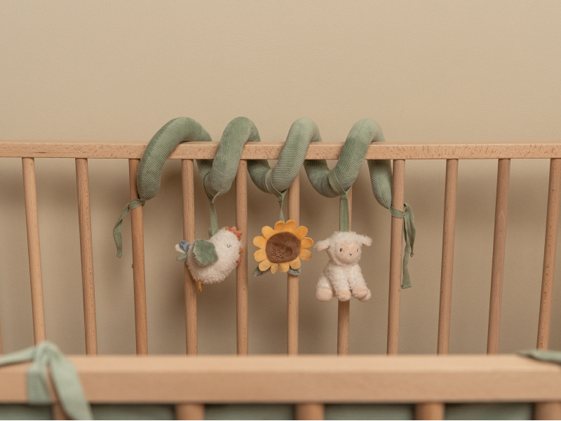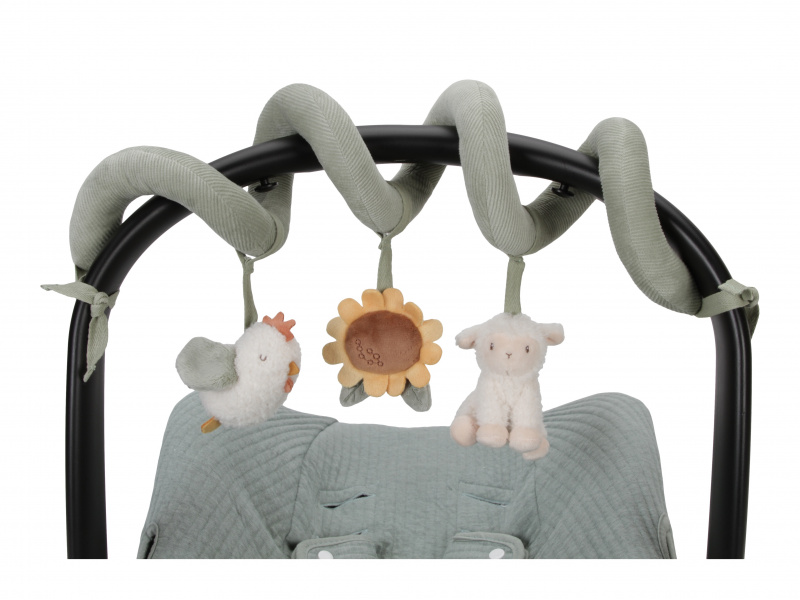 Textilní spirála se zavěšenými hračkami v podobě slepičky, ovečky a slunečnice zabaví vaše miminko v postýlce, kočárku i v autosedačce. Měkké hračky vyrobené z jemného plyše chrastí, šustí a nabízí různé textury pro zkoumání. Hračky stimulují koordinaci ruka / oko dítěte. Spirálu snadno připevníte omotáním kolem bočnice postýlky či madla autosedačky i kočárku. Spirála s hračkami je součástí designové kolekce hraček Little Dutch Farma. Rozměry: 22 x 13 x 12 cm Vhodné pro děti od narození.