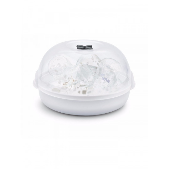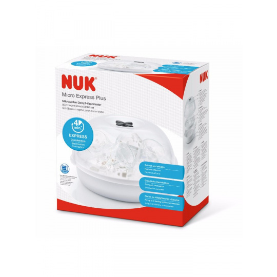Sterilizátor do mikrovlnné trouby Vario Express Plus Nuk. Parní sterilizátor do mikrovlnné trouby Micro Express Plus NUK až pro čtyři lahve a příslušenství, rychlý, účinný a důkladný. Je ideální pro každodenní sterilizaci kojeneckých lahví (kromě PA láhví) a příslušenství, které jsou vhodné do mikrovlnné trouby. Sterilizuje až čtyři lahve a příslušenství za pouhé čtyři minuty (nastavení výkonu na 1 000 wattů) se snadnou obsluhou. Součástí balení jsou kleště na láhve pro hygienické vyjmutí. Pozor na minimální potřebnou velikost mikrovlnné trouby. Rozměry: výška cca 18-19 cm, šířka cca 30 cm, hloubka cca 29-30, obvod cca 83 cm.