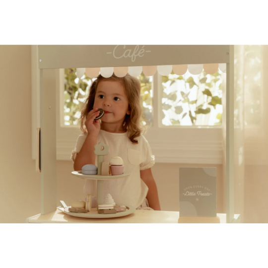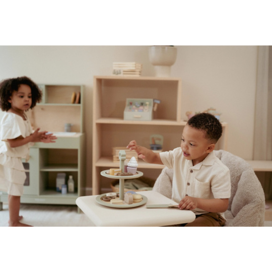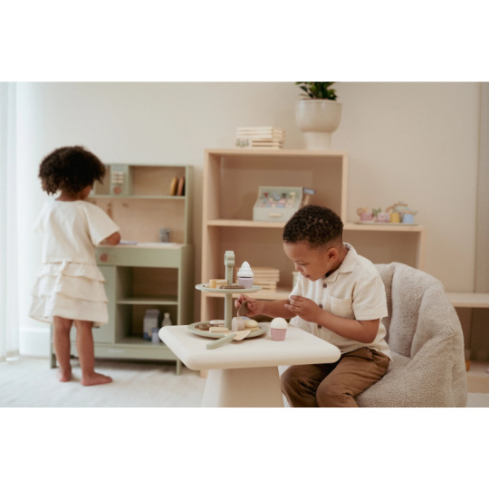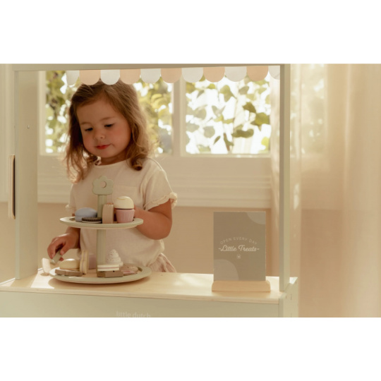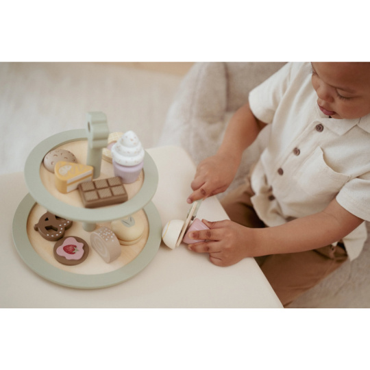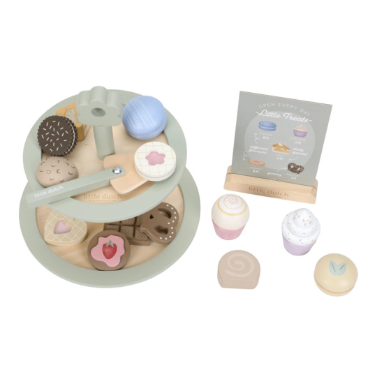 Máte chuť na sladký dezert? Nádherný stojan na cukroví Little Dutch s výběrem sladkých dobrot je jako stvořený pro všechny malé hostitele a hostitelky. Na dvou patrech mohou aranžovat a nabízet svým hostům různé druhy lákavých zákusků. Díky obrázkovému menu si hosté mohou vybírat a objednávat svou oblíbenou sladkost. Elegantní stojan v kvalitním dřevěném provedení je skvělým doplňkem pro hru na čajové dýchánky, narozeninové oslavy nebo vlastní dětskou cukrárnu. Podporuje rozvoj fantazie, jemné motoriky i sociálních dovedností – ať už děti obsluhují své plyšové kamarády, rodinu nebo pořádají hostinu pro princeznu z pohádkové země. Obsah balení: dvoupatrový stojan, servírovací lopatka, různé zákusky a obrázkové menu se stojánkem. Hračka je součástí kolekce vysoce kvalitních dřevěných hraček Little Dutch, navržených s důrazem na bezpečnost a originální design. Vyrobeno z odolného FSC certifikovaného dřeva. Rozměry: 22 × 23,6 × 22 cm Vhodné pro děti od 2 let.