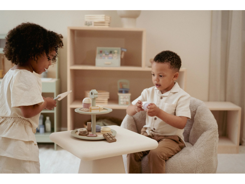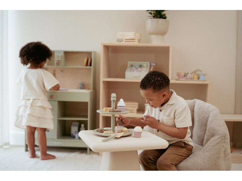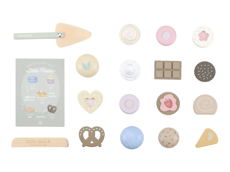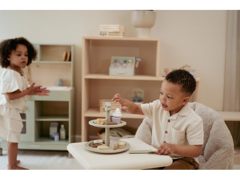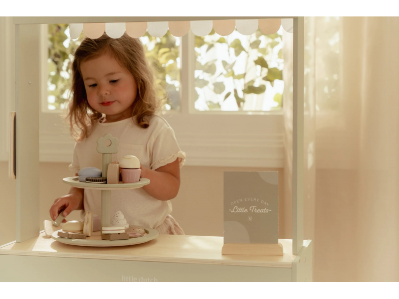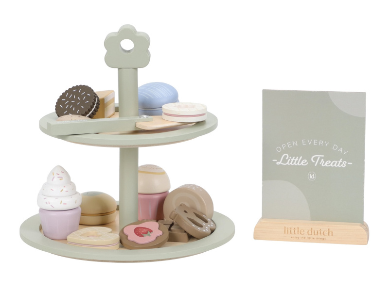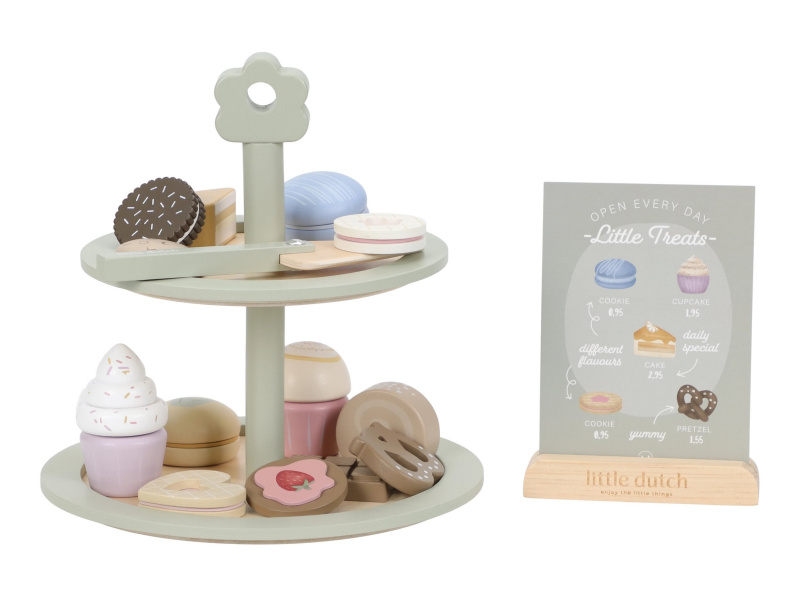 Máte chuť na sladký dezert? Nádherný stojan na cukroví Little Dutch s výběrem sladkých dobrot je jako stvořený pro všechny malé hostitele a hostitelky. Na dvou patrech mohou aranžovat a nabízet svým hostům různé druhy lákavých zákusků. Díky obrázkovému menu si hosté mohou vybírat a objednávat svou oblíbenou sladkost. Elegantní stojan v kvalitním dřevěném provedení je skvělým doplňkem pro hru na čajové dýchánky, narozeninové oslavy nebo vlastní dětskou cukrárnu. Podporuje rozvoj fantazie, jemné motoriky i sociálních dovedností – ať už děti obsluhují své plyšové kamarády, rodinu nebo pořádají hostinu pro princeznu z pohádkové země. Obsah balení: dvoupatrový stojan, servírovací lopatka, různé zákusky a obrázkové menu se stojánkem. Hračka je součástí kolekce vysoce kvalitních dřevěných hraček Little Dutch, navržených s důrazem na bezpečnost a originální design. Vyrobeno z odolného FSC certifikovaného dřeva. Rozměry: 22 × 23,6 × 22 cm Vhodné pro děti od 2 let.