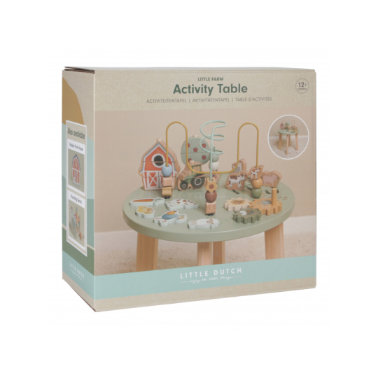 Dřevěný multifunkční stolek v krásném a vysoce kvalitním provedení nabízí vašemu dítěti množství různorodých aktivit, které dítě zabaví a zároveň pomáhají rozvíjet jeho jemnou motoriku i jednotlivé smysly. Lákat dítě ke zkoumání budou pohyblivé, posuvné i odnímatelné dřevěné díly v podobě traktoru, ovečky, kravičky a dalších motivů ze života na farmě. Díky stabilnímu dřevěnému provedení je stolek vhodný i pro děti, které hledají oporu při prvních krůčcích. Stolek je součástí designové kolekce hraček a doplňků Little Dutch Farma. Vyrobeno z dřeva certifikovaného FSC. Rozměry: 39 x 39 x 54 cm Vhodné pro děti od 12 měsíců.