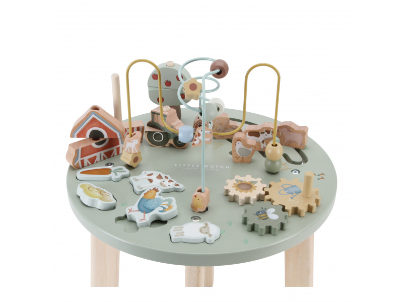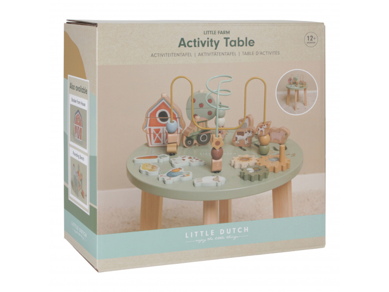 Dřevěný multifunkční stolek v krásném a vysoce kvalitním provedení nabízí vašemu dítěti množství různorodých aktivit, které dítě zabaví a zároveň pomáhají rozvíjet jeho jemnou motoriku i jednotlivé smysly. Lákat dítě ke zkoumání budou pohyblivé, posuvné i odnímatelné dřevěné díly v podobě traktoru, ovečky, kravičky a dalších motivů ze života na farmě. Díky stabilnímu dřevěnému provedení je stolek vhodný i pro děti, které hledají oporu při prvních krůčcích. Stolek je součástí designové kolekce hraček a doplňků Little Dutch Farma. Vyrobeno z dřeva certifikovaného FSC. Rozměry: 39 x 39 x 54 cm Vhodné pro děti od 12 měsíců.