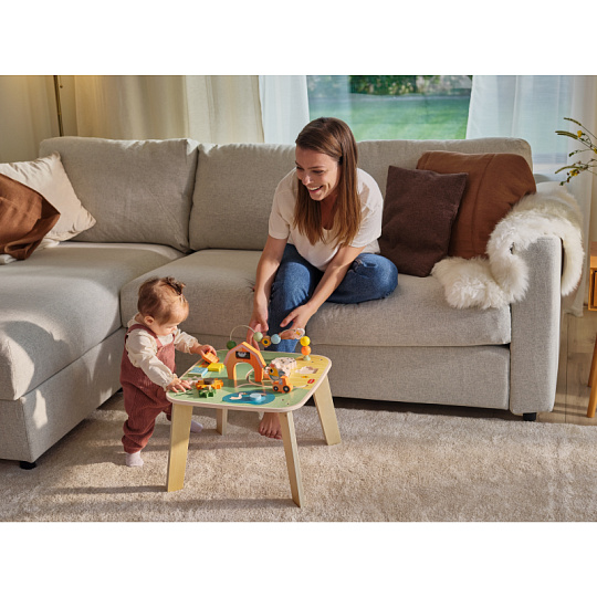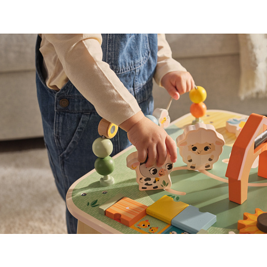 Dřevěný stolek s aktivitami Tiny Love je skvělá hračka pro malé objevitele, která nabízí spoustu možností, jak si hrát, zkoumat a učit se. Na jednom místě kombinuje různé pohyblivé prvky, vkládání a skrytá překvapení – dítě si tak přirozeně trénuje jemnou motoriku, koordinaci ruka–oko, soustředění i první logické uvažování. Stolek s krásnými motivy ze života na farmě podporuje samostatnou hru, ale zároveň je ideální i pro společné chvíle s rodiči nebo sourozenci. Stolek pomáhá rozvíjet jemnou motoriku, jednotlivé smysly, emoční inteligenci i kreativitu dítěte. Vyrobeno z kvalitního dřeva z odpovědně obhospodařovaných lesů. Rozměry (Š × V × H): 46,2 × 43 × 46,2 cm Vhodné pro děti od 12 měsíců.