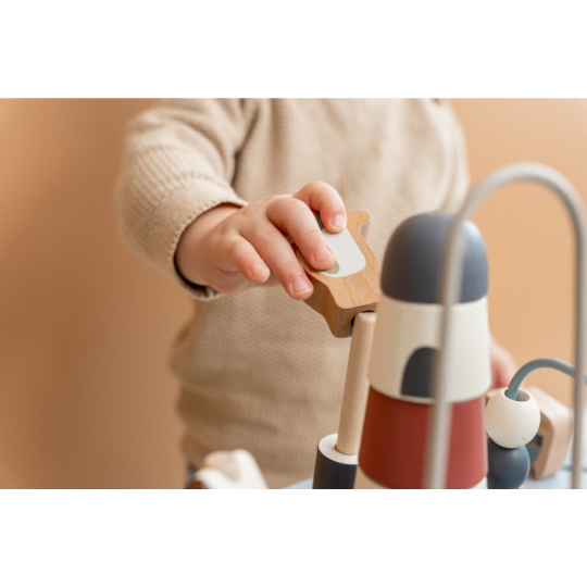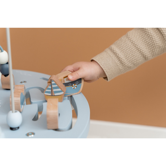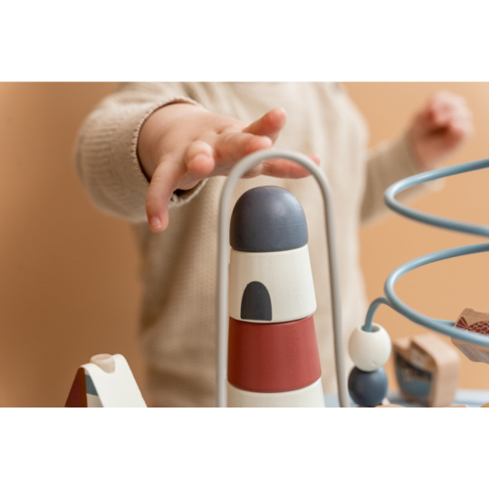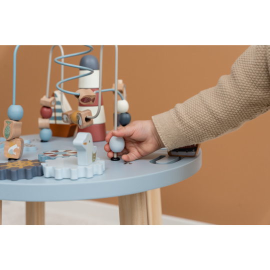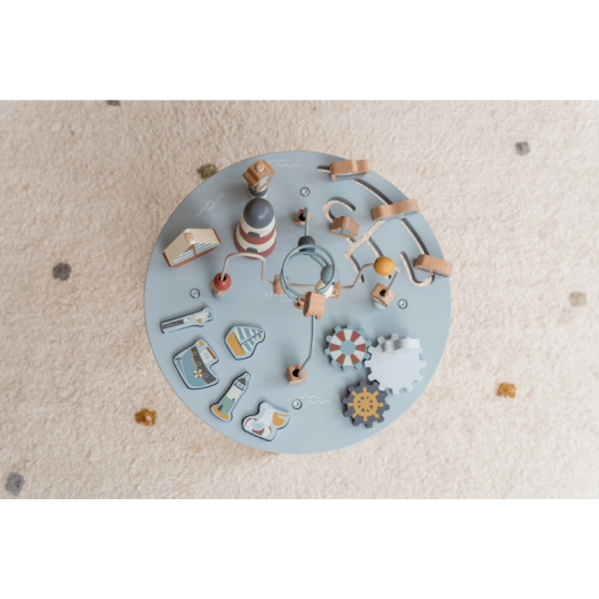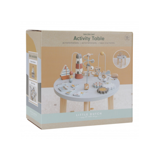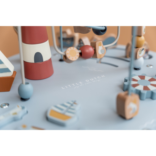 Dřevěný multifunkční stolek v krásném a vysoce kvalitním provedení nabízí vašemu dítěti množství různorodých aktivit, které dítě zabaví a zároveň pomáhají rozvíjet jeho jemnou motoriku i jednotlivé smysly. Lákat dítě ke zkoumání budou pohyblivé, posuvné i odnímatelné dřevěné díly v podobě plachetnice, majáku, racka a dalších motivů ze života na moři. Díky stabilnímu dřevěnému provedení je stolek vhodný i pro děti, které hledají oporu při prvních krůčcích. Stolek je součástí designové kolekce hraček a doplňků Little Dutch Námořnický záliv. Rozměry: 39 x 39 x 54 cm Vhodné pro děti od 12 měsíců.