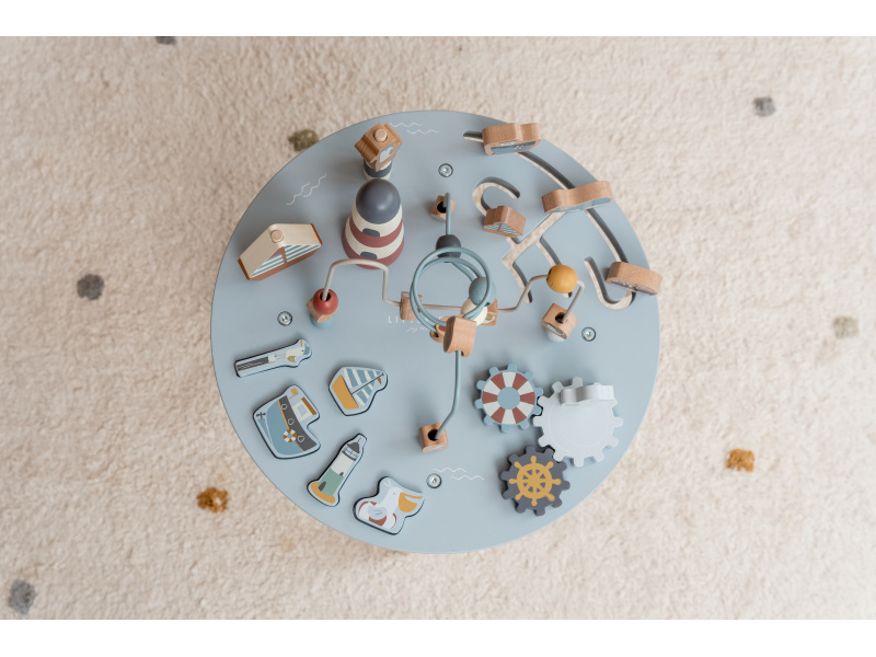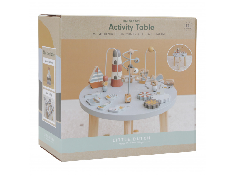 Dřevěný multifunkční stolek v krásném a vysoce kvalitním provedení nabízí vašemu dítěti množství různorodých aktivit, které dítě zabaví a zároveň pomáhají rozvíjet jeho jemnou motoriku i jednotlivé smysly. Lákat dítě ke zkoumání budou pohyblivé, posuvné i odnímatelné dřevěné díly v podobě plachetnice, majáku, racka a dalších motivů ze života na moři. Díky stabilnímu dřevěnému provedení je stolek vhodný i pro děti, které hledají oporu při prvních krůčcích. Stolek je součástí designové kolekce hraček a doplňků Little Dutch Námořnický záliv. Rozměry: 39 x 39 x 54 cm Vhodné pro děti od 12 měsíců.