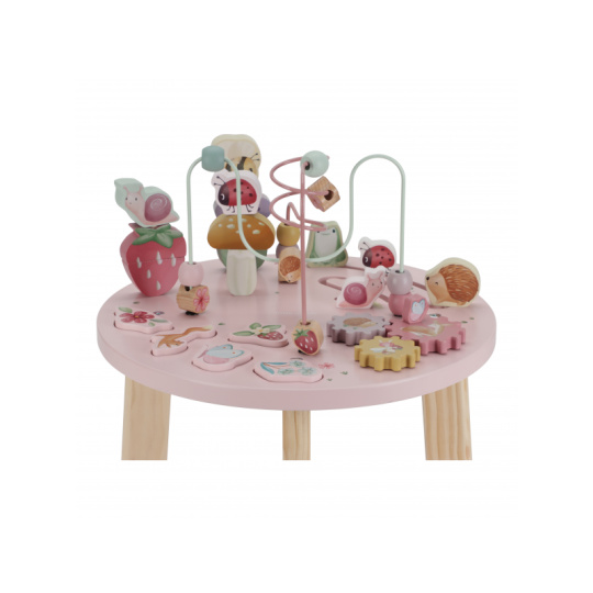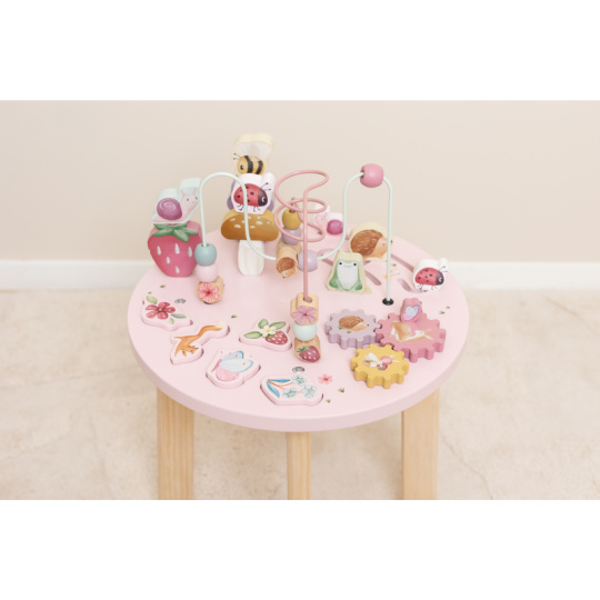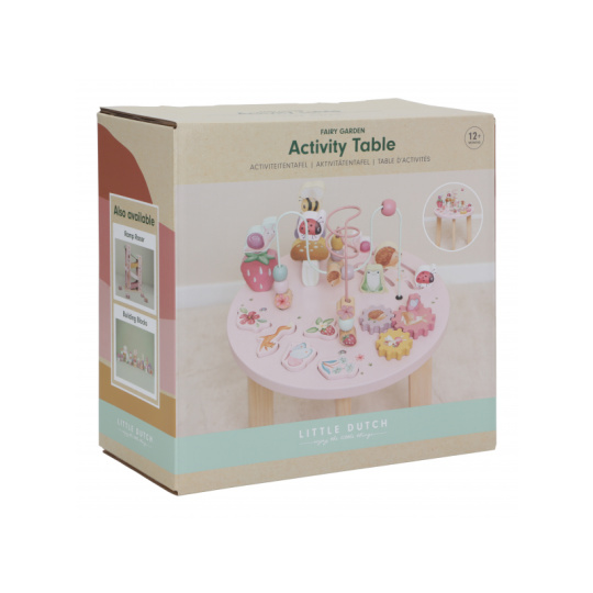 Dřevěný multifunkční stolek v krásném a vysoce kvalitním provedení nabízí vašemu dítěti množství různorodých aktivit, které dítě zabaví a zároveň pomáhají rozvíjet jeho jemnou motoriku i jednotlivé smysly. Lákat dítě ke zkoumání budou pohyblivé, posuvné i odnímatelné dřevěné díly v podobě ježka, šneka, berušky, jahůdky a dalších motivů ze života na zahradě. Díky stabilnímu dřevěnému provedení je stolek vhodný i pro děti, které hledají oporu při prvních krůčcích. Stolek je součástí designové kolekce hraček a doplňků Little Dutch Fairy Garden inspirované životem na zahradě. Vyrobeno z dřeva certifikovaného FSC. Rozměry: 39 x 39 x 54 cm Vhodné pro děti od 12 měsíců.