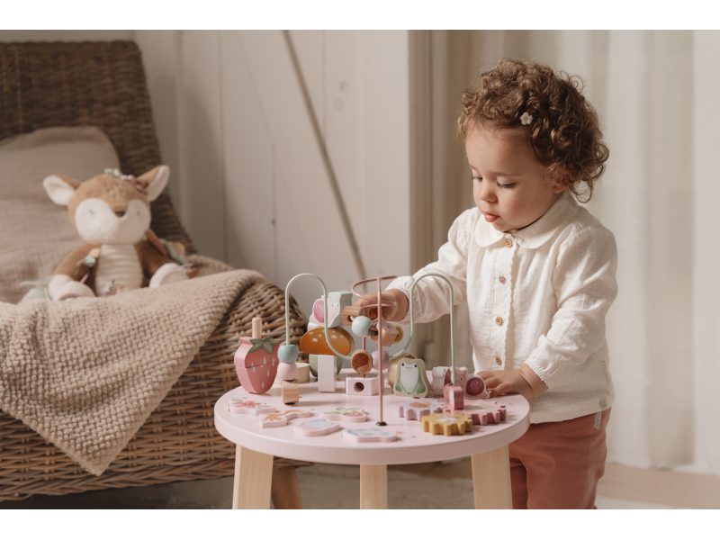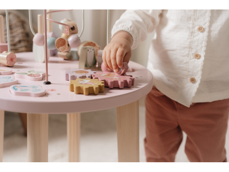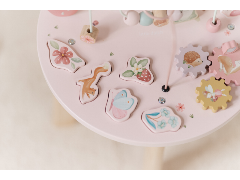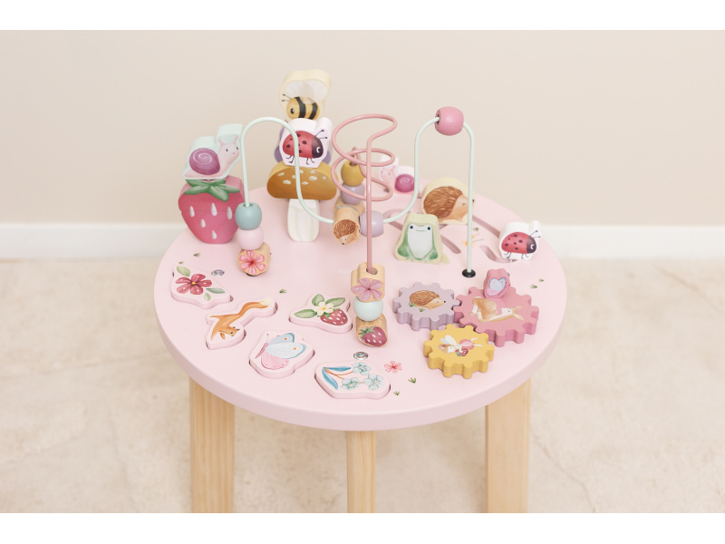 Dřevěný multifunkční stolek v krásném a vysoce kvalitním provedení nabízí vašemu dítěti množství různorodých aktivit, které dítě zabaví a zároveň pomáhají rozvíjet jeho jemnou motoriku i jednotlivé smysly. Lákat dítě ke zkoumání budou pohyblivé, posuvné i odnímatelné dřevěné díly v podobě ježka, šneka, berušky, jahůdky a dalších motivů ze života na zahradě. Díky stabilnímu dřevěnému provedení je stolek vhodný i pro děti, které hledají oporu při prvních krůčcích. Stolek je součástí designové kolekce hraček a doplňků Little Dutch Fairy Garden inspirované životem na zahradě. Vyrobeno z dřeva certifikovaného FSC. Rozměry: 39 x 39 x 54 cm Vhodné pro děti od 12 měsíců.
