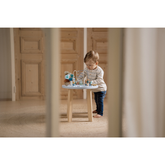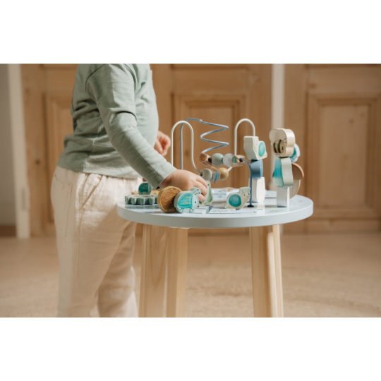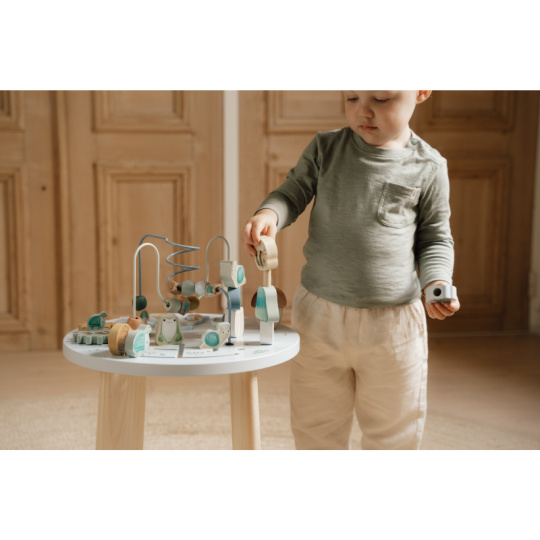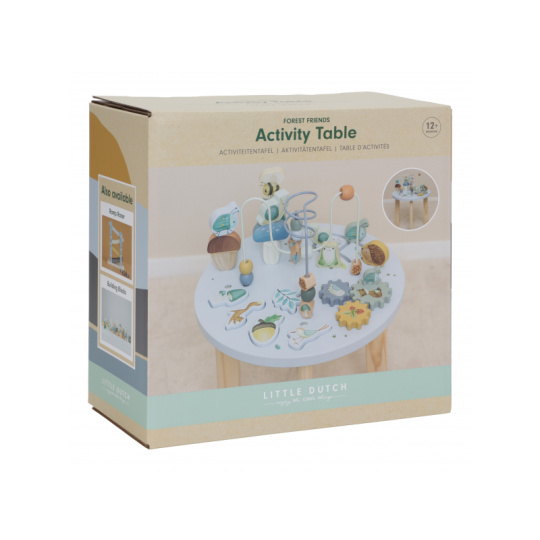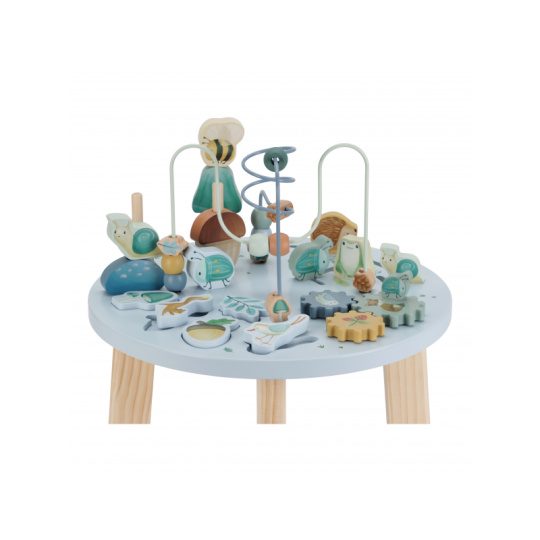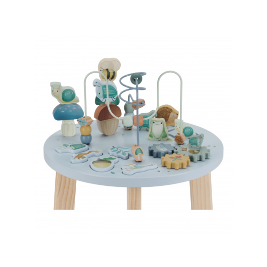 Dřevěný multifunkční stolek v krásném a vysoce kvalitním provedení nabízí vašemu dítěti množství různorodých aktivit, které dítě zabaví a zároveň pomáhají rozvíjet jeho jemnou motoriku i jednotlivé smysly. Lákat dítě ke zkoumání budou pohyblivé, posuvné i odnímatelné dřevěné díly v podobě ježka, šneka, žáby, houbiček a dalších motivů ze života v lese. Díky stabilnímu dřevěnému provedení je stolek vhodný i pro děti, které hledají oporu při prvních krůčcích. Stolek je součástí designové kolekce hraček a doplňků Little Dutch Forest Friends inspirované životem v lese. Vyrobeno z dřeva certifikovaného FSC. Rozměry: 39 x 39 x 54 cm Vhodné pro děti od 12 měsíců.