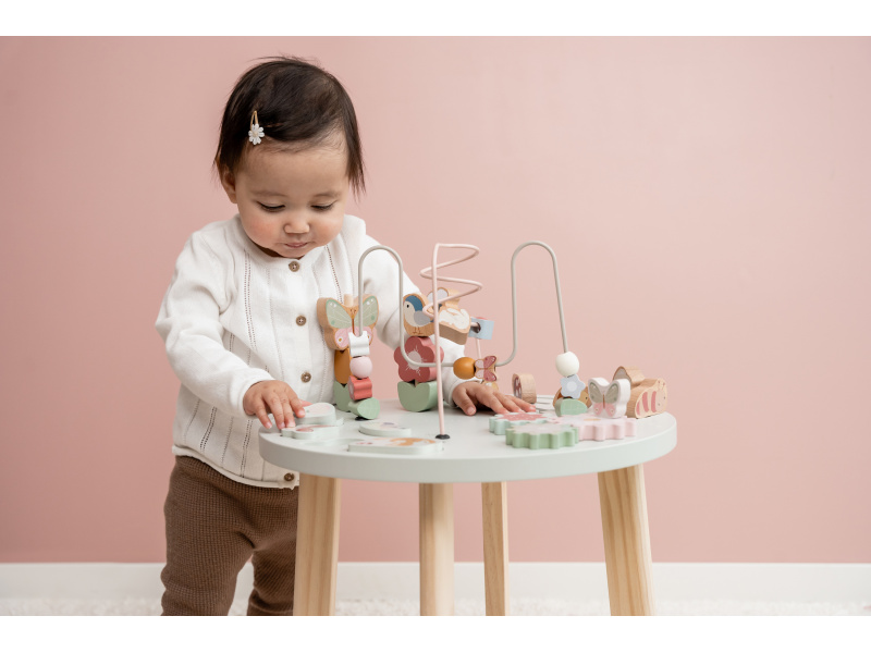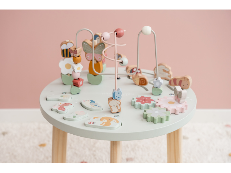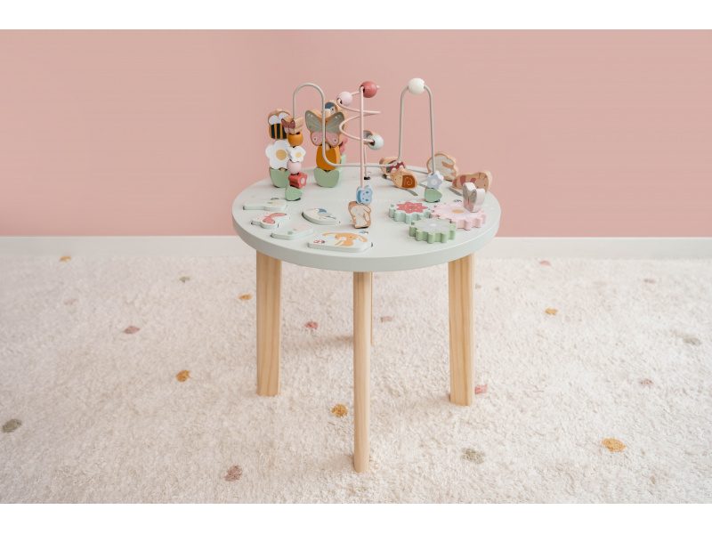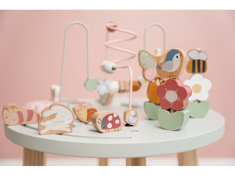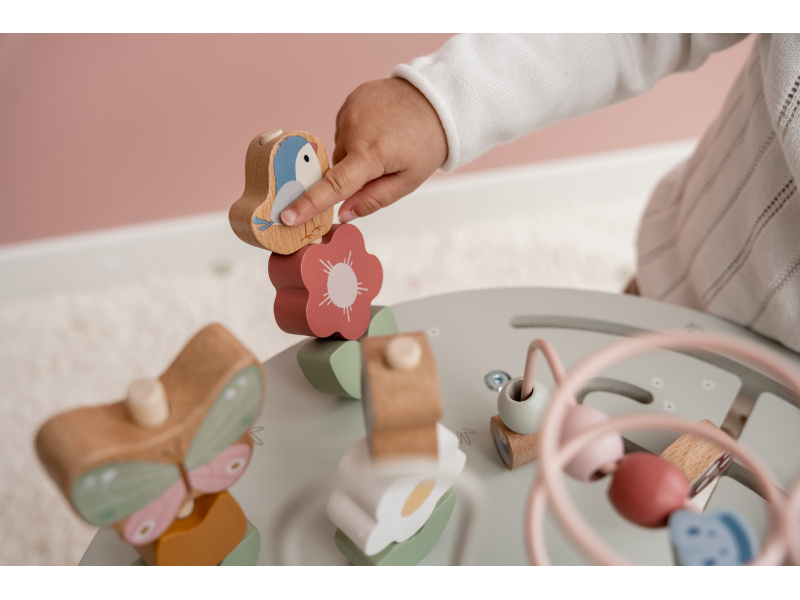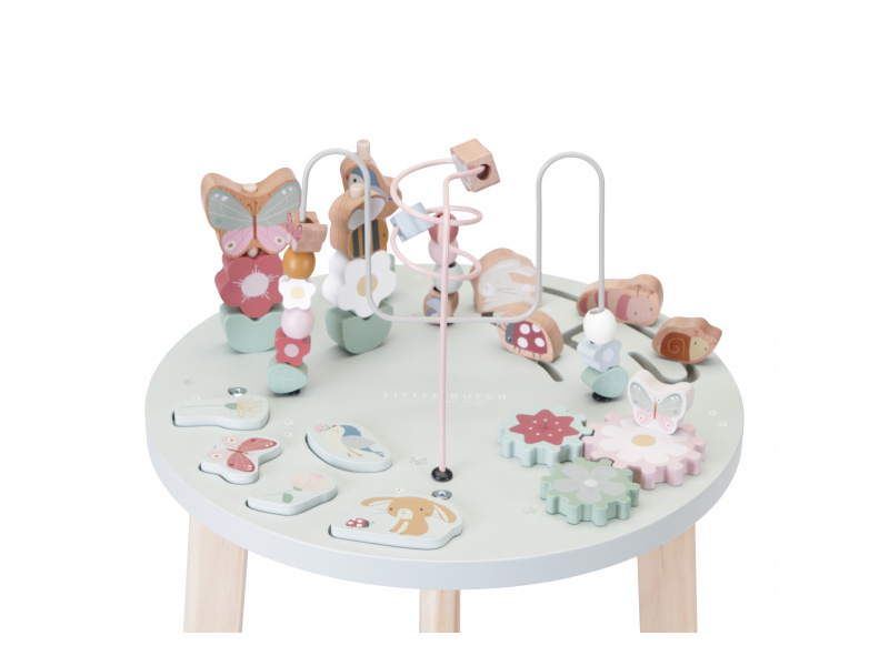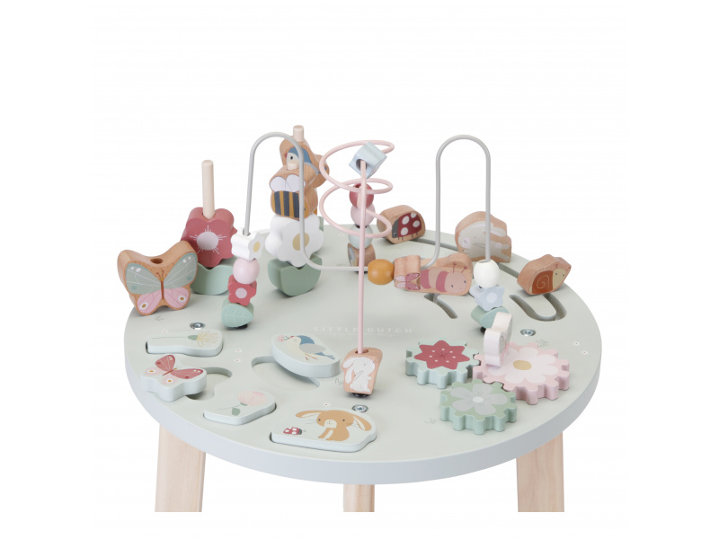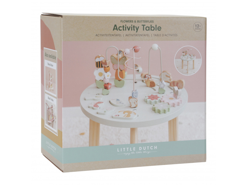 Dřevěný multifunkční stolek v krásném a vysoce kvalitním provedení nabízí vašemu dítěti množství různorodých aktivit, které dítě zabaví a zároveň pomáhají rozvíjet jeho jemnou motoriku i jednotlivé smysly. Lákat dítě ke zkoumání budou pohyblivé, posuvné i odnímatelné dřevěné díly v podobě květin, motýlů a dalších obyvatel rozkvetlé louky. Díky stabilnímu dřevěnému provedení je stolek vhodný i pro děti, které hledají oporu při prvních krůčcích. Stolek je součástí designové kolekce hraček a doplňků Little Dutch Květiny a motýli. Rozměry: 39 x 39 x 54 cm Vhodné pro děti od 12 měsíců.