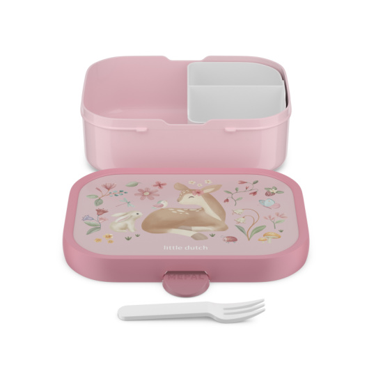 Praktický svačinový box nabízí možnost rozdělení na tři přihrádky pro oddělení jednotlivých částí uložené svačinky. Součástí boxu je i malá vidlička, která je ideální pro napichování kousků ovoce či zeleniny. Zacvakávací uzávěr je zárukou bezpečného uzavření obsahu boxu. Box je součástí designové řady hraček a doplňků Little Dutch Fairy Garden, inspirované životem na zahradě. Materiál: PP, ABS Rozměry: 17,8 x 13,2 x 6 cm Objem: 750 ml Vhodné do myčky.