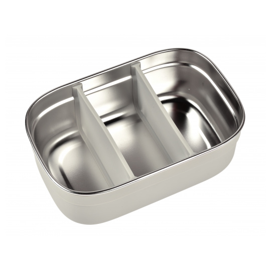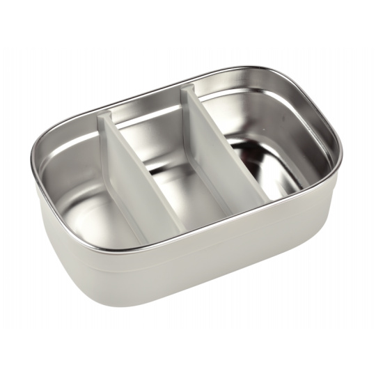 Nerezový svačinový box je ideální pro přenášení a uchování dětské svačinky či oběda. Dvě vnitřní odnímatelné silikonové přepážky umožňují oddělit jednotlivé části svačinky. Silikonový odnímatelný potah usnadňuje uchopení a chrání box před poškozením. Silikonové víčko bezpečně chrání obsah boxu. Nerezová ocel je zdravý a odolný materiál, který je ideální pro ukládání potravin, nedochází k přenosu chuti, zápachu ani k zabarvení uloženými potravinami. Díky své nízké hmotnosti je ideální pro použití ve škole i na výletech. Box je možné mýt ručně i v myčce, výrobce doporučuje ruční mytí. Zdravotně nezávadný materiál neobsahuje BPA, BPS ani ftaláty. Rozměry: 17,6 x 11,6 x 5,8 cm