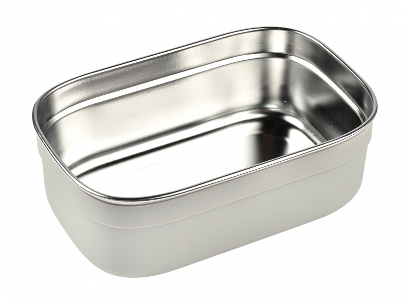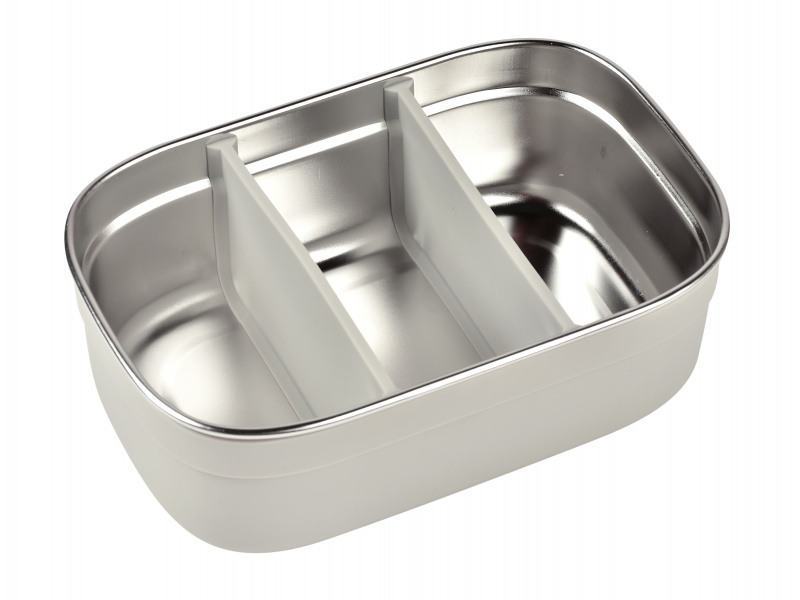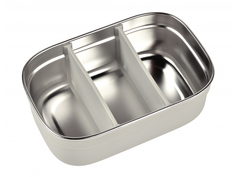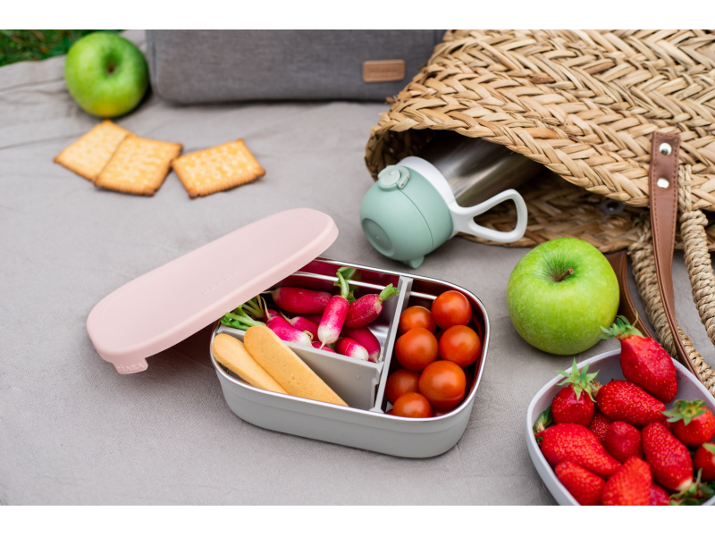 Nerezový svačinový box je ideální pro přenášení a uchování dětské svačinky či oběda. Dvě vnitřní odnímatelné silikonové přepážky umožňují oddělit jednotlivé části svačinky. Silikonový odnímatelný potah usnadňuje uchopení a chrání box před poškozením. Silikonové víčko bezpečně chrání obsah boxu. Nerezová ocel je zdravý a odolný materiál, který je ideální pro ukládání potravin, nedochází k přenosu chuti, zápachu ani k zabarvení uloženými potravinami. Díky své nízké hmotnosti je ideální pro použití ve škole i na výletech. Box je možné mýt ručně i v myčce, výrobce doporučuje ruční mytí. Zdravotně nezávadný materiál neobsahuje BPA, BPS ani ftaláty. Rozměry: 17,6 x 11,6 x 5,8 cm