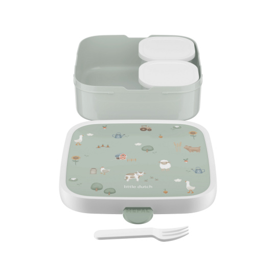 Velký svačinový box má uvnitř dvě vyjímatelné krabičky s víčkem pro oddělení jednotlivých částí uložené svačinky. Součástí boxu je i malá vidlička, která je ideální pro napichování kousků ovoce či zeleniny. Zacvakávací uzávěr je zárukou bezpečného uzavření obsahu boxu. Box je součástí designové řady hraček a doplňků Little Dutch Farma. Materiál: PP, PE Rozměry: 18,4 x 18,2 x 6,5 cm Objem: 1300 ml Vhodné do myčky a pro ohřívání v mikrovlnce (bez víčka).