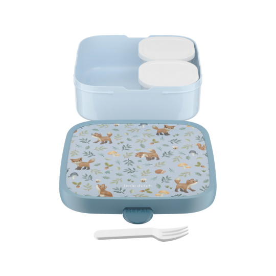 Velký svačinový box má uvnitř dvě vyjímatelné krabičky s víčkem pro oddělení jednotlivých částí uložené svačinky. Součástí boxu je i malá vidlička, která je ideální pro napichování kousků ovoce či zeleniny. Zacvakávací uzávěr je zárukou bezpečného uzavření obsahu boxu. Box je součástí designové řady hraček a doplňků Little Dutch Forest Friends, inspirované životem v lese. Materiál: PP, PE Rozměry: 18,4 x 18,2 x 6,5 cm Objem: 1300 ml Vhodné do myčky a pro ohřívání v mikrovlnce (bez víčka).