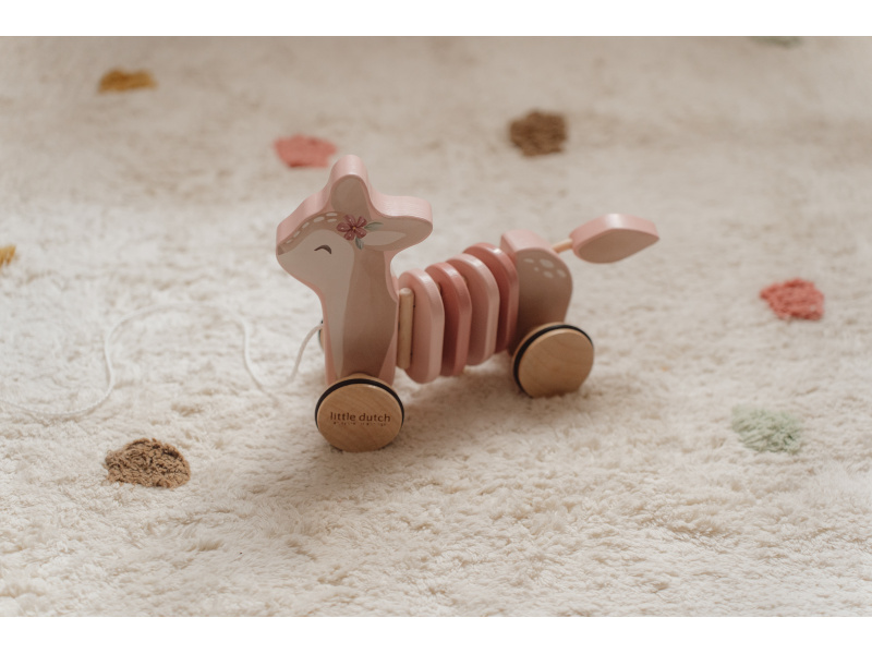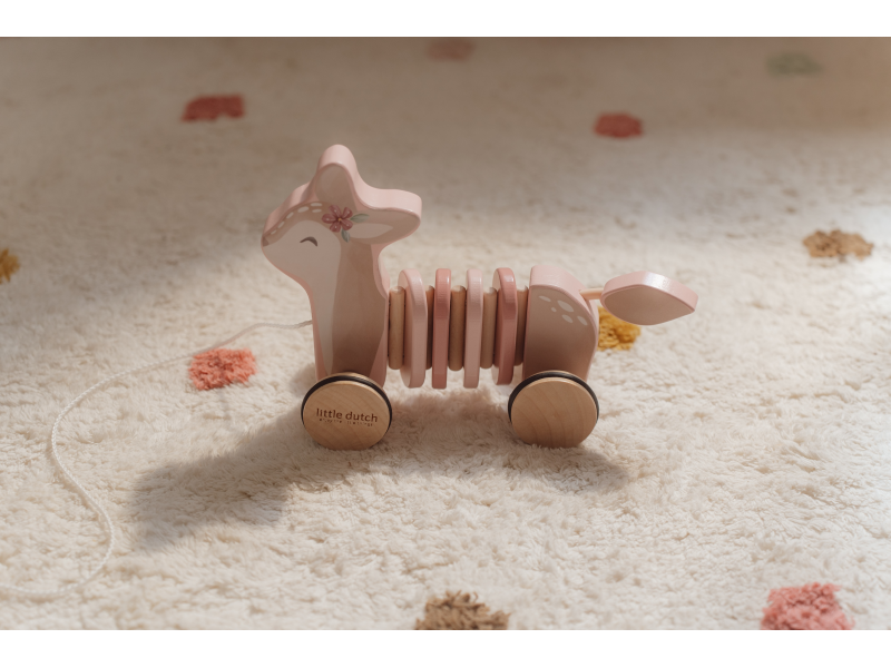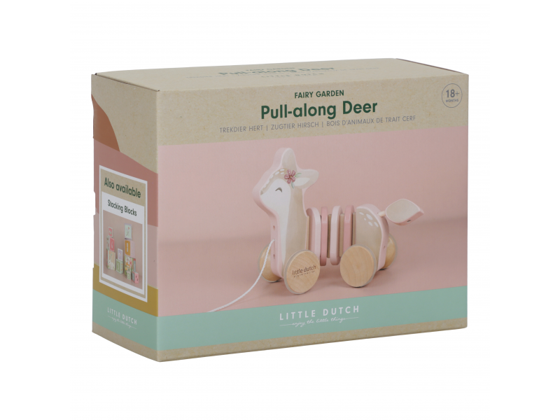 Srnka na kolečkách v krásném dřevěném provedení má šňůrku, aby ji dítě mohlo tahat za sebou. Hračka je součástí designové kolekce hraček a doplňků Little Dutch Fairy Garden inspirované životem na zahradě. Vyrobeno z dřeva certifikovaného FSC. Rozměry: 24 x 9,7 x 17,7 cm Vhodné pro děti od 12 měsíců.
