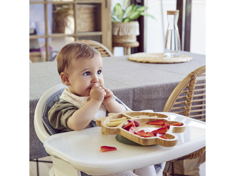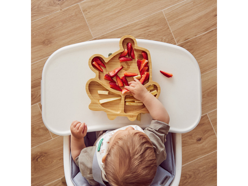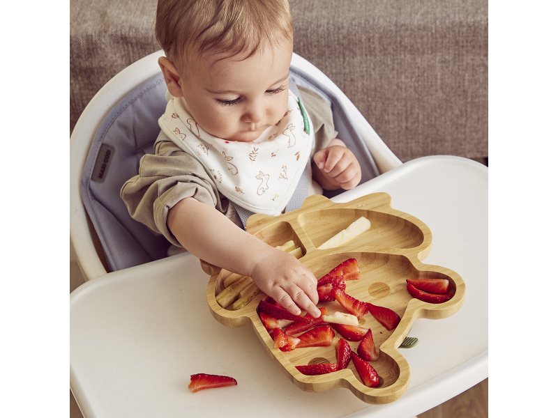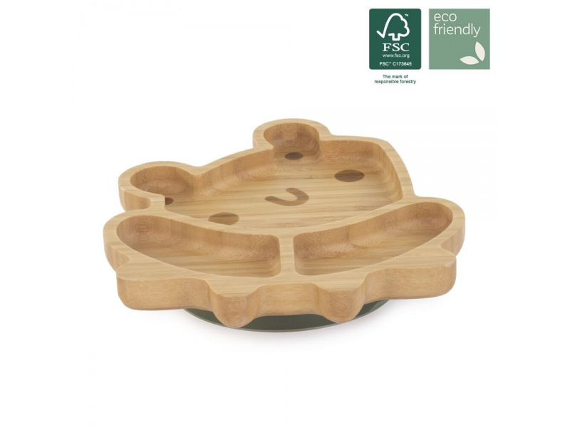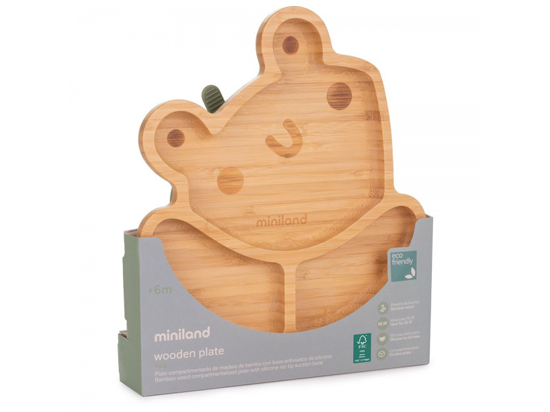 Dělený talíř v krásném provedení z bambusového dřeva ve tvaru žáby je vybaven odnímatelnou silikonou přísavkou, díky které neklouže po stole či jídelním pultu židličky. Talíř se třemi přihrádkami je ideální i pro BLW metodu, při které se strava nemixuje a dítě se krmí samo. Výrobek není vhodný do myčky ani mikrovlnné trouby. Pro delší životnost jednou měsíčně potřete dřevo kokosovým olejem a nechte přes noc uschnout. Složení: bambus, silikon Vhodné pro děti od 6 měsíců.