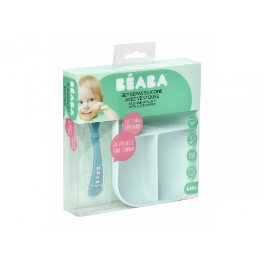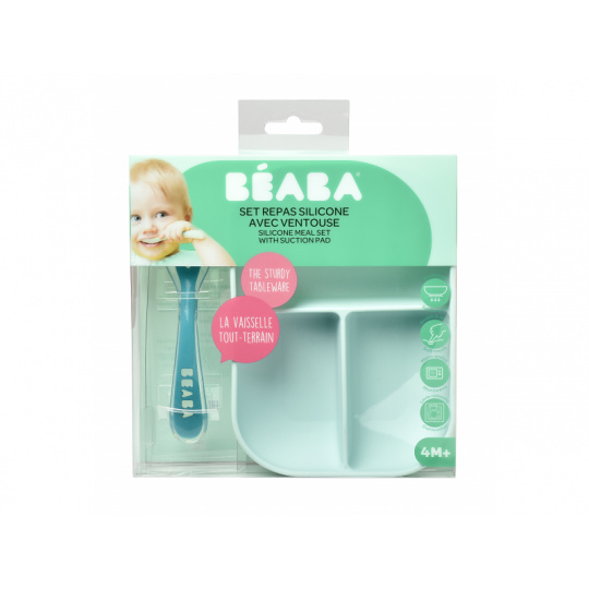 Talíř s přísavkou z vysoce kvalitního silikonu umožňuje uchycení ke stolu nebo pultu jídelní židličky. Ergonomický tvar usnadňuje nabírání příkrmu. Tři přihrádky umožňují oddělené servírování jednotlivých součástí dětského pokrmu. Silikonová lžička má ideální tvar pro dětská ústa. Tvar držadla usnadňuje dítěti držení lžičky a je tak ideální i pro jeho první pokusy o samostatné krmení. Lžička má na spodní straně rukojeti opěrku pro možnost hygienického odložení lžičky na stůl. Silikonový měkký materiál je bezpečný a příjemný při používání. Je odolný vysokým i nízkým teplotám a není náchylný k vytváření skvrn od barevných potravin. Vhodné do myčky i mikrovlnné trouby. Neobsahuje BPA. Pro děti od 4 měsíců.