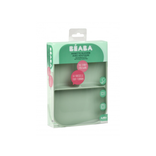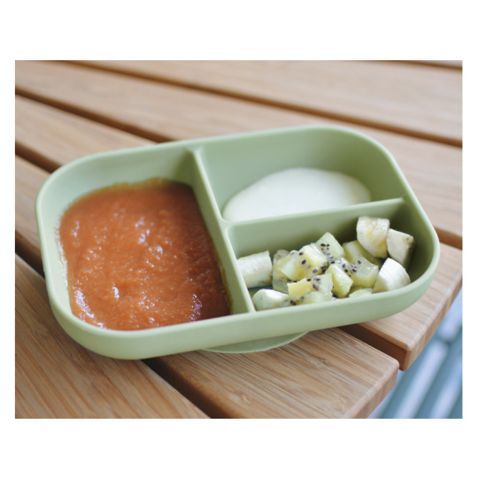 Talíř s přísavkou z vysoce kvalitního silikonu umožňuje uchycení ke stolu nebo pultu jídelní židličky. Ergonomický tvar usnadňuje nabírání příkrmu. Tři přihrádky umožňují oddělené servírování jednotlivých součástí dětského pokrmu. Silikonový měkký materiál je bezpečný a příjemný při používání. Je odolný vysokým i nízkým teplotám a není náchylný k vytváření skvrn od barevných potravin. Vhodné do myčky i mikrovlnné trouby. Neobsahuje BPA. Pro děti od 4 měsíců.