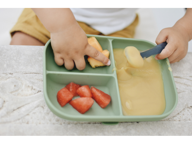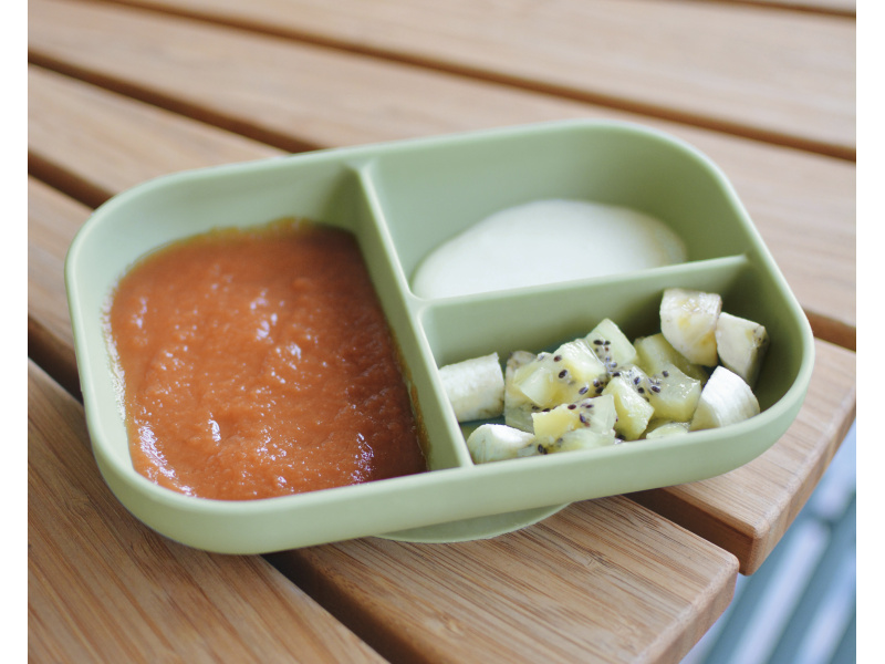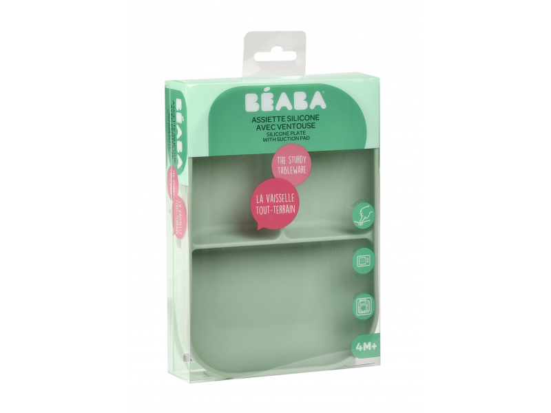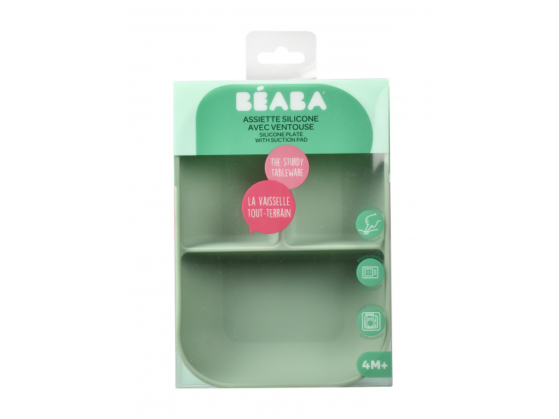 Talíř s přísavkou z vysoce kvalitního silikonu umožňuje uchycení ke stolu nebo pultu jídelní židličky. Ergonomický tvar usnadňuje nabírání příkrmu. Tři přihrádky umožňují oddělené servírování jednotlivých součástí dětského pokrmu. Silikonový měkký materiál je bezpečný a příjemný při používání. Je odolný vysokým i nízkým teplotám a není náchylný k vytváření skvrn od barevných potravin. Vhodné do myčky i mikrovlnné trouby. Neobsahuje BPA. Pro děti od 4 měsíců.