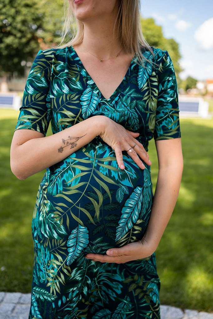 Těhotenské a kojící šaty Two Ways LONG milk & love. Těhotenské a kojící šaty Two Ways Long jsou šaty, které se přizpůsobí měnícím se tvarům postavy v těhotenství i po porodu. Můžete ho nosit s výstřihem vepředu - pak lze použít i jako kojící šaty, nebo s výstřihem na zádech. Po dokončení kojení se dají stále používat jako "obyčejné" šaty. Dlouhé šaty Two Ways Long se dají stylizovat pro různé příležitosti - hodí se především na větší rodinné akce, například jako šaty na křest. Skvěle bude vypadat i v ležérním stylu s teniskami nebo balerínami. Dlouhé elegantní těhotenské šaty z lehké viskózy s krásným tropickým potiskem. Šaty jsou ušité z nejkvalitnější prodyšné látky, které prošly přísnými testy Oeko-Tex Standard 100. Díky nim je oblečení měkké a příjemné na dotek pro maminku i dítě. Při výběru velikosti těhotenských a kojících šatů Two Ways Long se řiďte velikostí, kterou aktuálně nosíte. Pokud váháte mezi dvěma velikostmi - zvolte tu menší. Rozměrová tabulka je poslední fotografie. Složení: 92% viskóza, 8% elastan.