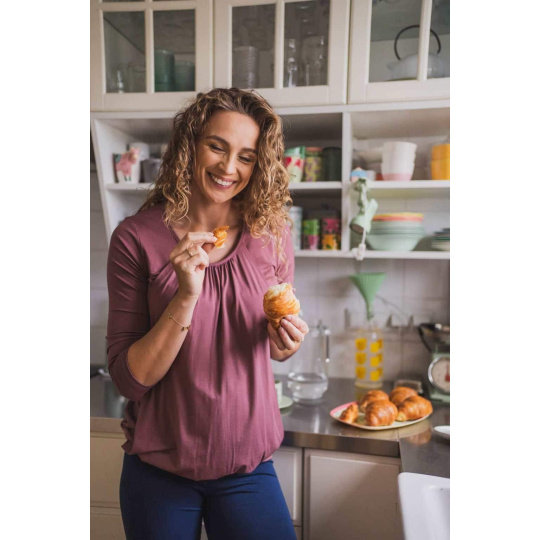 Těhotenské a kojící tričko Kangaroo milk & love. Těhotenské a kojící halenky-trička Klokánky jsou vyrobeny z elastického viskózového materiálu, který se pěkně přizpůsobí měnícím se tvarům těla v těhotenství i po něm. Kvalitní viskózová vlákna se nedeformují, díky tomu halenka neztrácí svůj tvar a po porodu nadále slouží jako kojící halenka. Důmyslně skrytý otvor s lehce zakrývajícími prsními záložkami umožňuje pohodlné a diskrétní kojení všude tam, kde má vaše děťátko hlad. Výstřih je zakončený ozdobným nařasením, je dostatečně dlouhé, aby vám zakrylo záda a abyste se v těhotenství cítili pohodlně. Tričko je ušito z nejkvalitnější látky, která prošlá přísnými testy Oeko-Tex Standard 100 – díky nim jsou těhotenské a kojící halenky jemné na dotek a bezpečné pro matku i dítě. Při výběru velikosti kojící/těhotenské halenky se řiďte velikostí, kterou právě nosíte. Oblečení je z elastického materiálu a krásně se přizpůsobí postavě. Je to velká velikost, takže pokud váháte mezi dvěma velikostmi – zvolte tu menší. Rozměrovou tabulku naleznete jako poslední fotografii. Složení: 92% viskóza, 8% elastan. Délka rukávů 7/8.