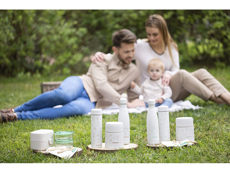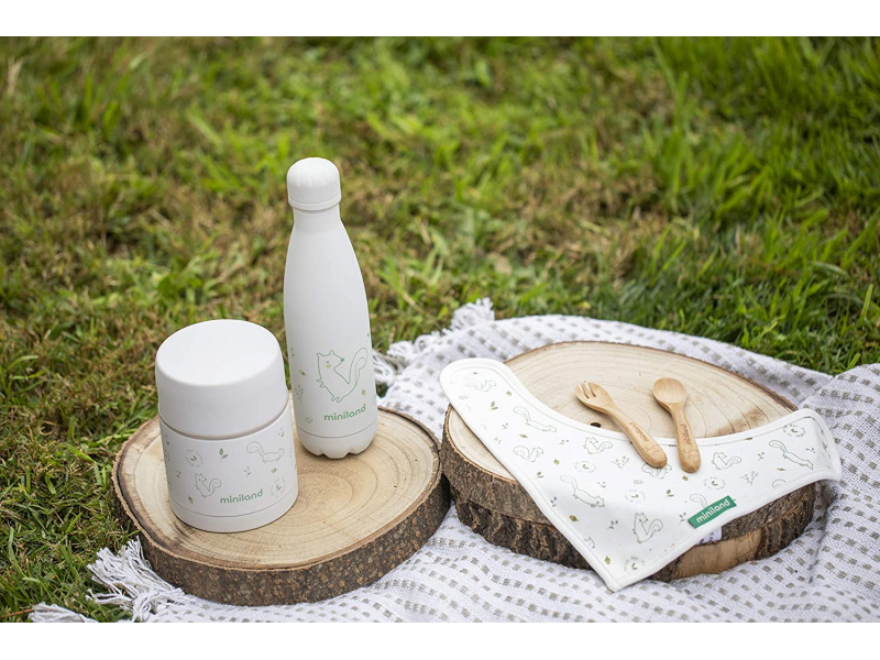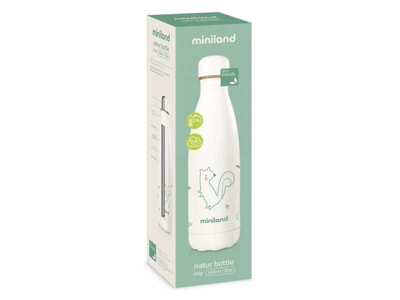 Vakuová termoska Miniland ve tvaru láhve je vyrobena z vysoce kvalitní dvoustěnné oceli a díky tomu udrží až 24 hodin požadovanou teplotu nápoje. Termoska je potažena jemným materiálem pro příjemné uchopení. Tvar termosky umožňuje snadné pití přímo z termosky. Objem: 500 ml Neobsahuje BPA.