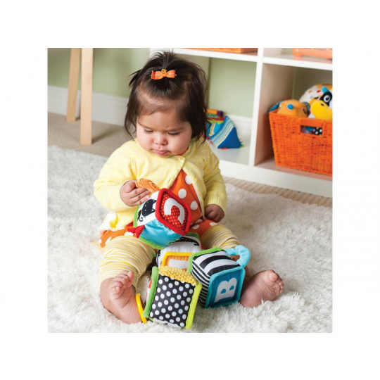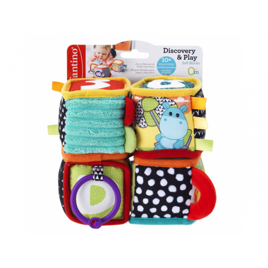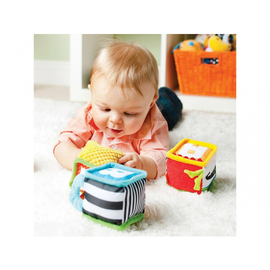 Čtyři měkké textilní kostky nabízí různorodé aktivity a textury ke zkoumání a pozorování. Kostky je možné skládat na sebe i s nimi házet, ve starším věku dítěte s jejich pomocí můžete dítě učit barvy a první písmenka i čísla. Hračka pomáhá rozvíjet jednotlivé smysly dítěte i jeho jemnou motoriku. Vhodné pro děti od narození.