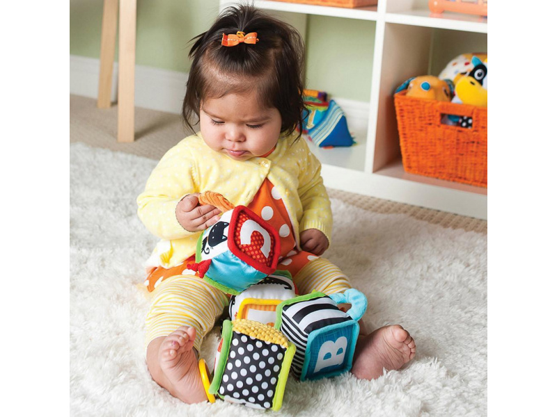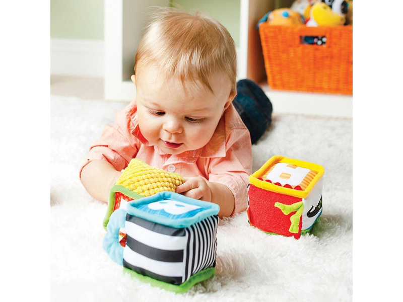 Čtyři měkké textilní kostky nabízí různorodé aktivity a textury ke zkoumání a pozorování. Kostky je možné skládat na sebe i s nimi házet, ve starším věku dítěte s jejich pomocí můžete dítě učit barvy a první písmenka i čísla. Hračka pomáhá rozvíjet jednotlivé smysly dítěte i jeho jemnou motoriku. Vhodné pro děti od narození.