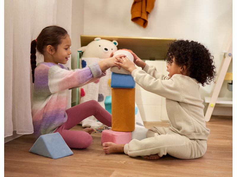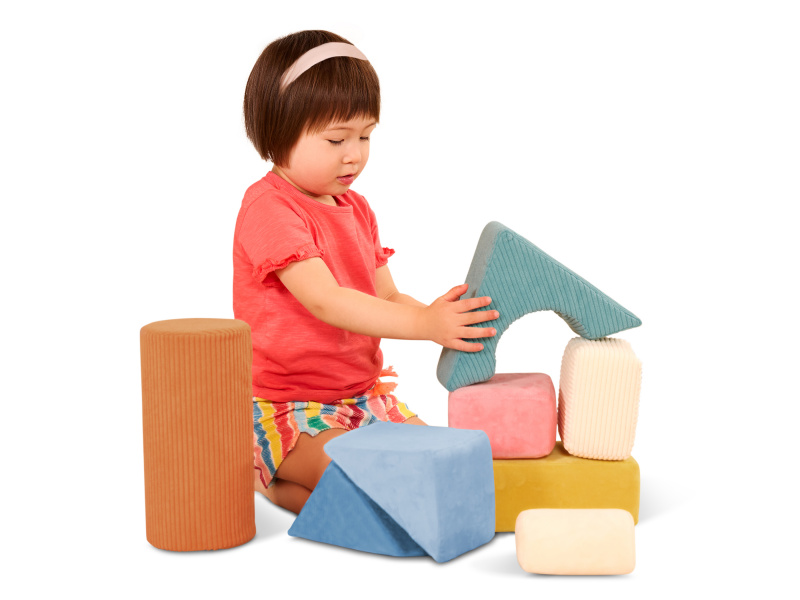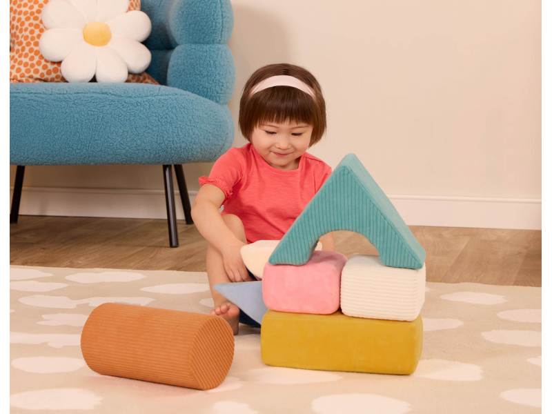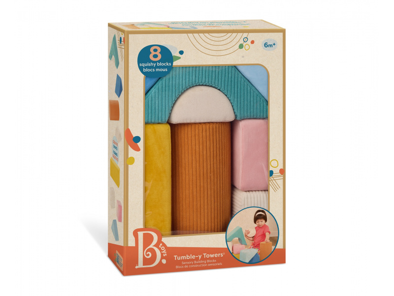 Stavět, mačkat, objevovat – s měkkými pěnovými kostkami Tumble-y Towers od B. Toys si děti užijí hodiny hravého učení! Tato sada osmi kostek v různých tvarech je navržena speciálně pro nejmenší stavitele – kostky jsou lehké, měkké a potažené různorodými texturovanými látkami pro rozvoj hmatu a smyslového vnímání. Děti si mohou stavět vlastní věže, zkoumat barvy a tvary nebo kostky jen tak mačkat a objímat. Hraní s Tumble-y Towers podporuje koordinaci oko-ruka, kreativitu i první motorické dovednosti. Balení obsahuje 8 kostek. Vhodné pro děti od 6 měsíců.