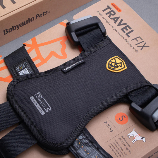 Travel Fix je první cestovní postroj pro psy, který obsahuje systém Isofix + Top Tether. Toto spojení zajišťuje optimální ukotvení ve vozidle a potřebné zachycení v případě nárazu nebo náhlého brzdění. Velikost S je určena pro psy od 2 do 10 kg.