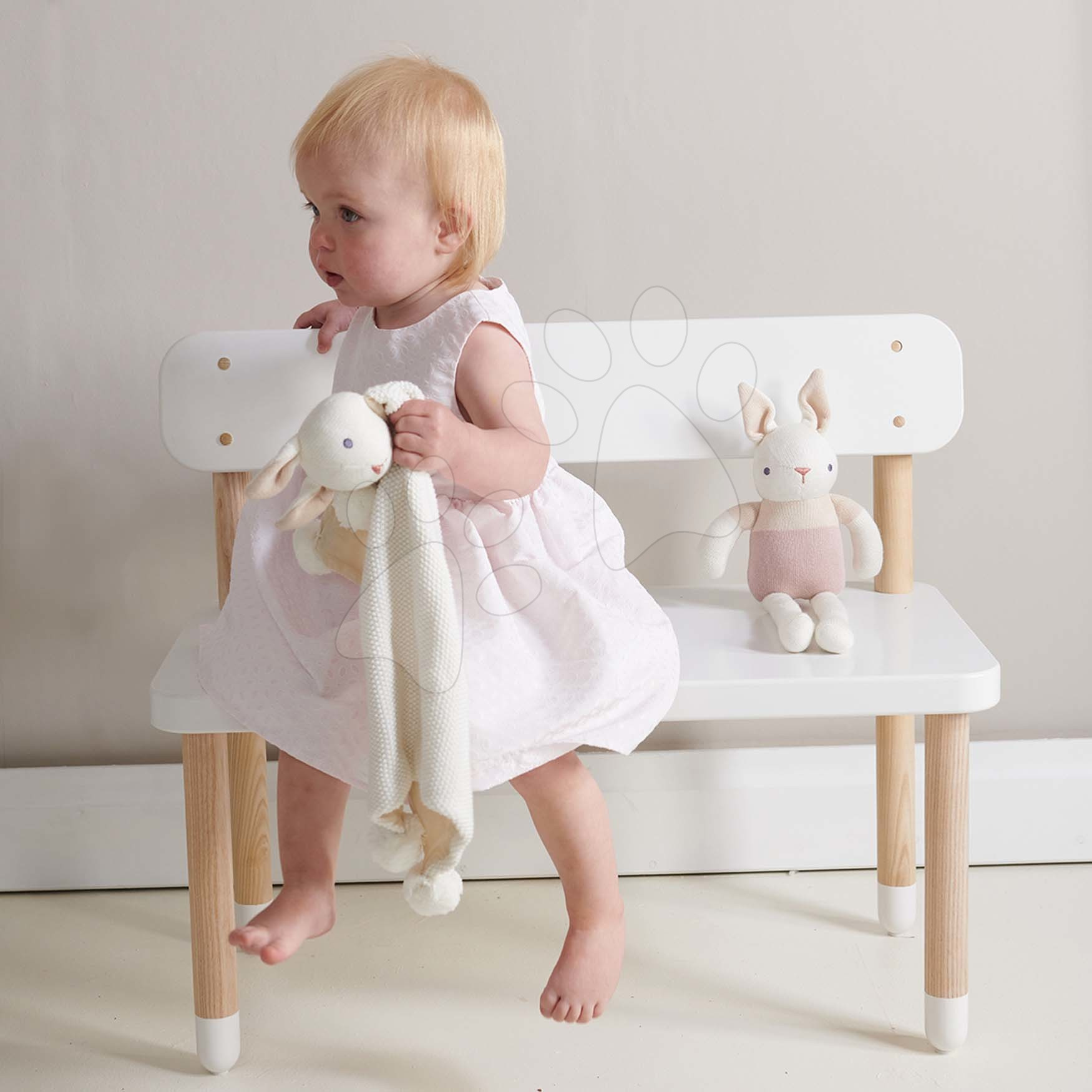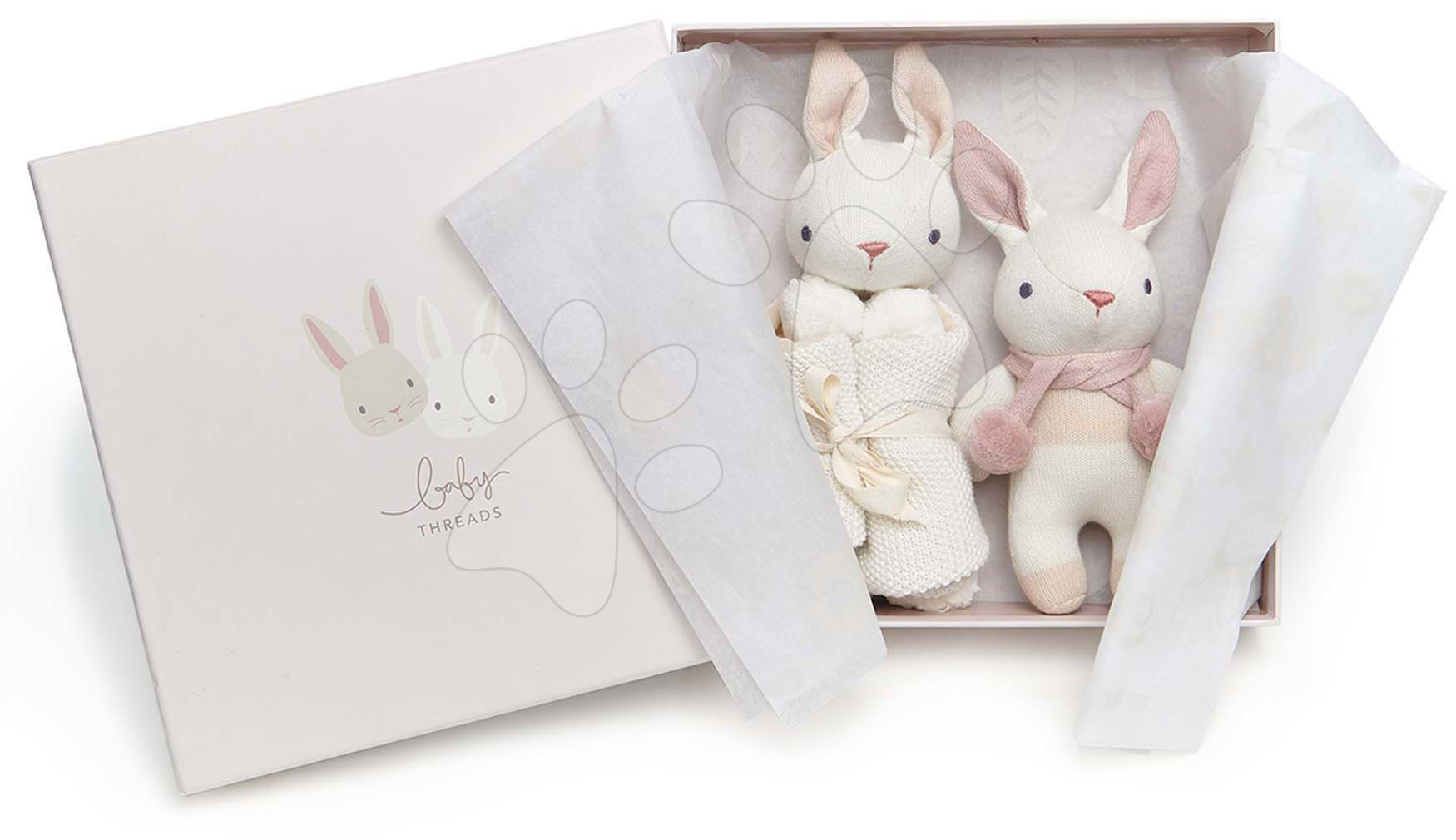 Panenky pletené zajíčci Baby Threads Gift Set spolu tvoří okouzlující soupravu, která je vhodná pro všechna miminka již od narození. Krásné pletené panenky jsou vyrobeny z příjemné měkoučké organické bavlny a za jejich designem stojí přední designéři značky ThreadBear Design. Stanou se nerozlučnými společníky vašeho miminka, které s nimi bude snáze usínat. V nadčasové sadě se nachází panenka krémového zajíčka s růžovou šálou o výšce 22 cm a zajíček na mazlení ve čtvercovém tvaru, ke kterému se děti snadno přitulí, dodává jim pocit bezpečí a jistoty. Sada pletených panenek je ideálním doplňkem do dětské postýlky, vaši nejmenší se s nimi mohou bez obav mazlit a objímat.